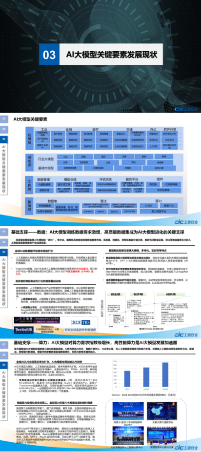 从关键要素发展现状来看,在基础支撑方面,一是AI大模型训练数据需求激增,高质量数据集成为AI大模型进化的关键支撑;二是AI大模型对算力需求指数级增长,高性能算力是AI大模型发展加速器;三是Transformer奠定了AI大模型进化基础,拉开了AI大模型时代序幕;四是AI大模型工具链相继涌现,降低AI大模型训练和调优门槛。在模型应用方面,一是科技巨头凭借数据、算力优势,着力构建AI大模型底座;二是人工智能企业和传统企业凭借行业数据优势,积极锤炼行业大模型;三是场景大模型成为企业应用创新突破口,激发了创新热情和创造活力。