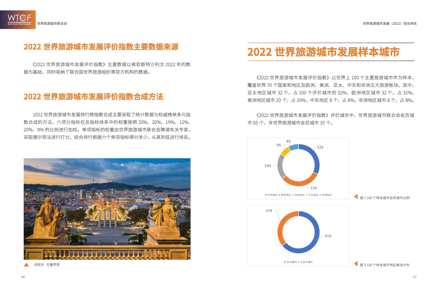 《2022 世界旅游城市发展评价指数》以世界上 100 个主要旅游城市作为样本, 覆盖世界 70 个国家和地区及欧洲、美洲、亚太、中东和非洲五大旅游板块。其中, 亚太地区城市32个,占100 个评价城市的32%,欧洲地区城市 32个,占32%, 美洲地区城市 20个,占20%,中东地区8个,占8%,非洲地区城市8个,占8%。