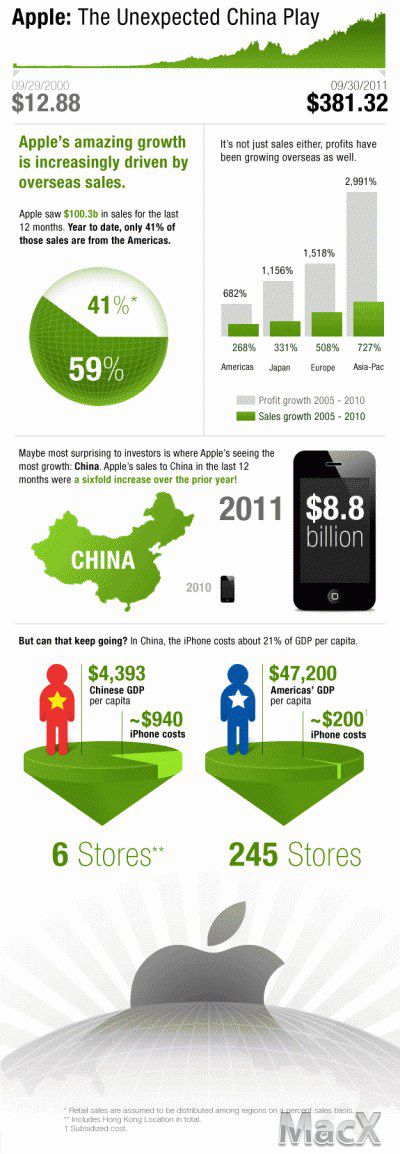 2. 不仅是销售额,苹果的利润增长最快的市场也是亚太地区,从2005至2010年,苹果在亚太地区实现的利润增长率达到惊人的2991%,而中国则是这一地区的最重要贡献者。