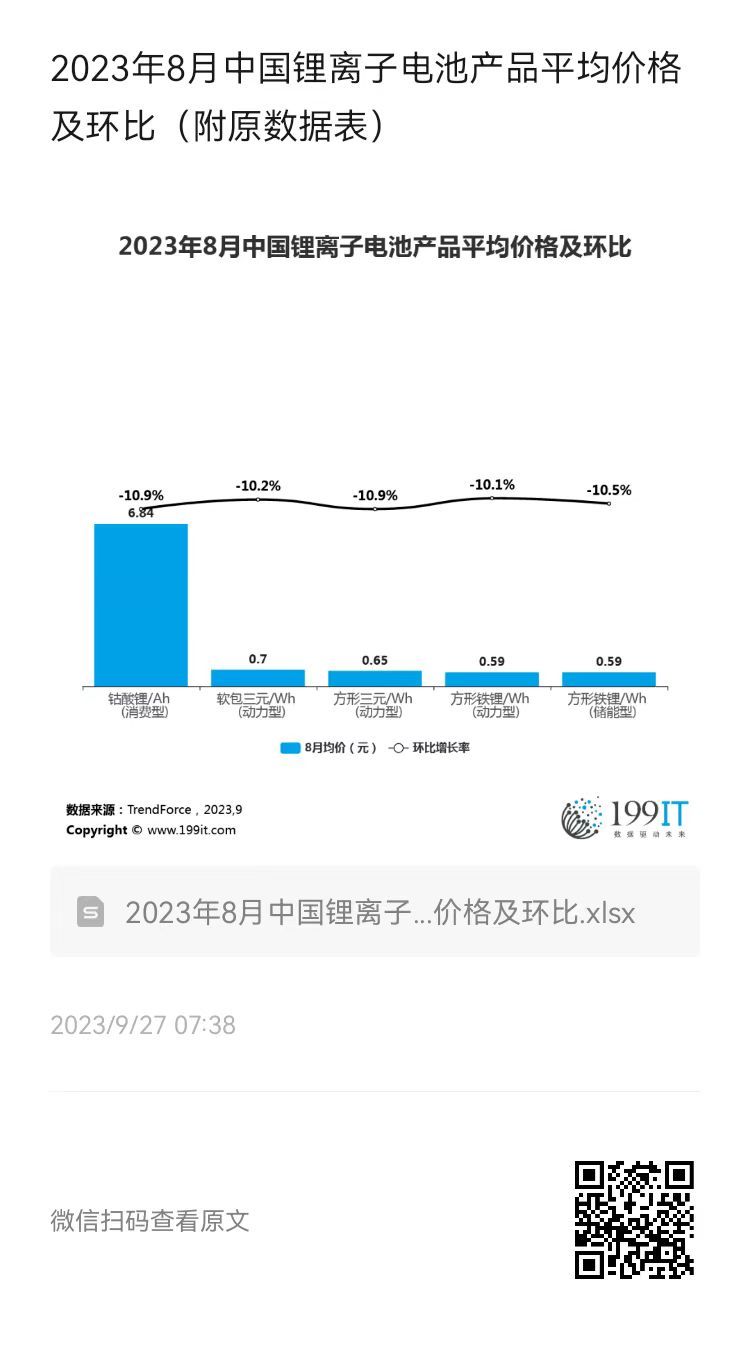 - 2023年7月中国锂离子电池产品平均价格及环比(附原数据表)