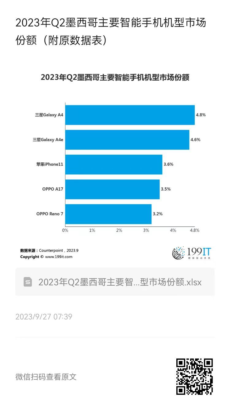 2023年Q2墨西哥主要智能手机机型市场份额(附原数据表) ​​​