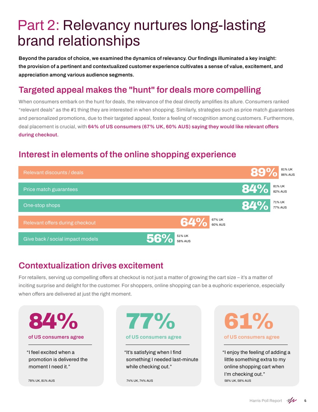 美国受访者表示,相关的折扣和交易(89%)是他们在网上购物时最感兴趣的因素。值得注意的是,64%的人对结账时的相关优惠感兴趣,61%的人喜欢结账时额外购买一些商品。