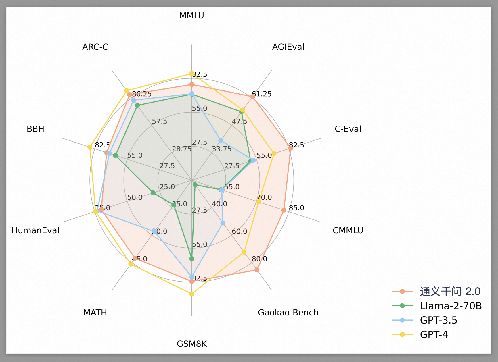 在MMLU、C-Eval、GSM8K、HumanEval、MATH等10个主流Benchmark测评集上,通义千问2.0的得分整体超越Meta的Llama-2-70B,相比OpenAI的Chat-3.5是九胜一负,相比GPT-4则是四胜六负,与GPT-4的差距进一步缩小。