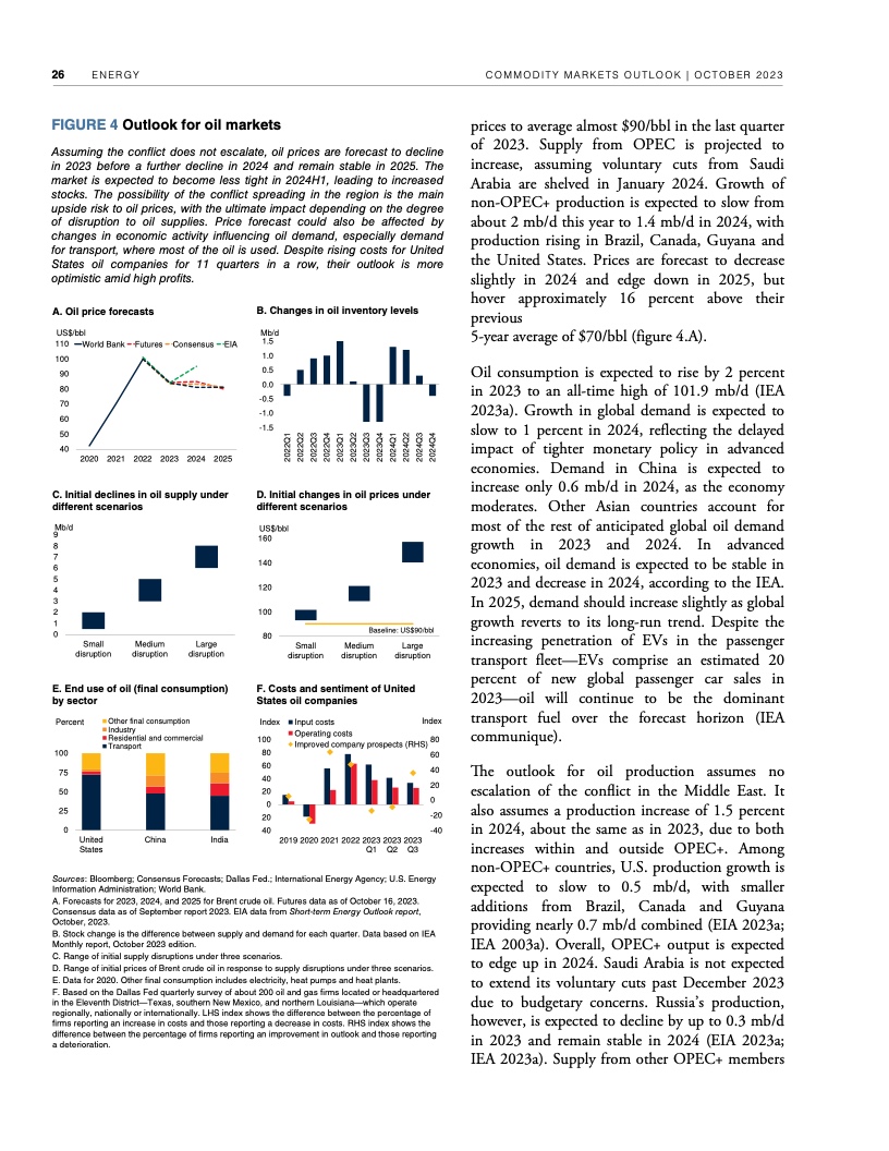 报告初步评估了冲突对大宗商品市场可能产生的近期影响。报告认为,如果冲突不扩大,影响应该有限。根据世行的基线预测,本季度油价预计平均每桶90美元,明年随着全球经济增长放缓而回落至平均每桶81美元。大宗商品价格预计明年下降4.1%。随着供应增加,明年农业大宗商品价格预计会下行。2024年基本金属价格预测下降5%。2025年大宗商品价格有望趋于稳定。