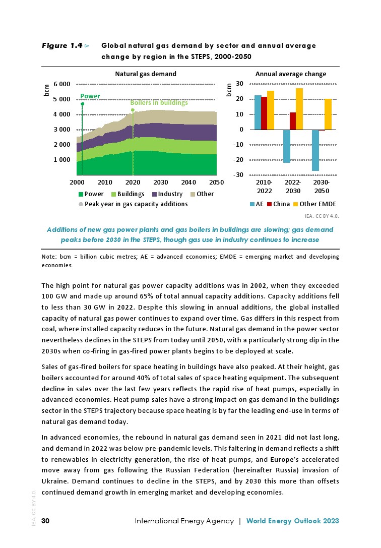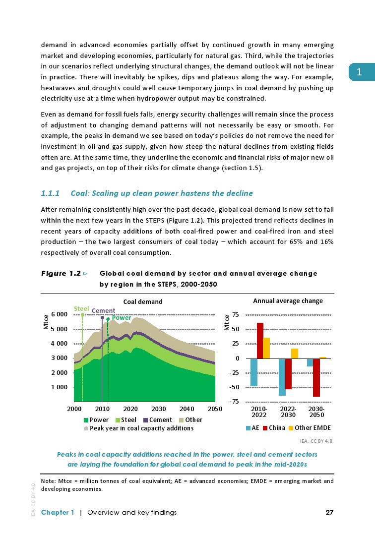 全球能源危机的一个遗留问题可能是迎来化石燃料时代结束的开始:清洁能源转型背后的势头现在足以使全球对煤炭、石油和天然气的需求在2030年之前达到STEPS的高点。