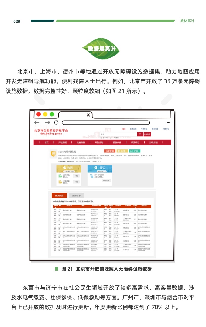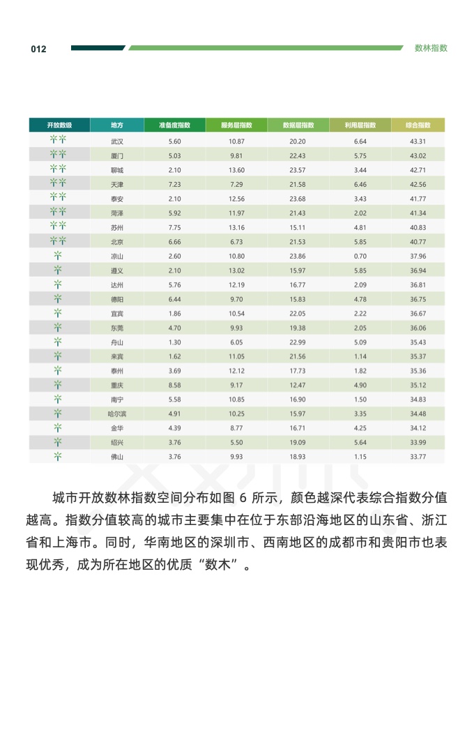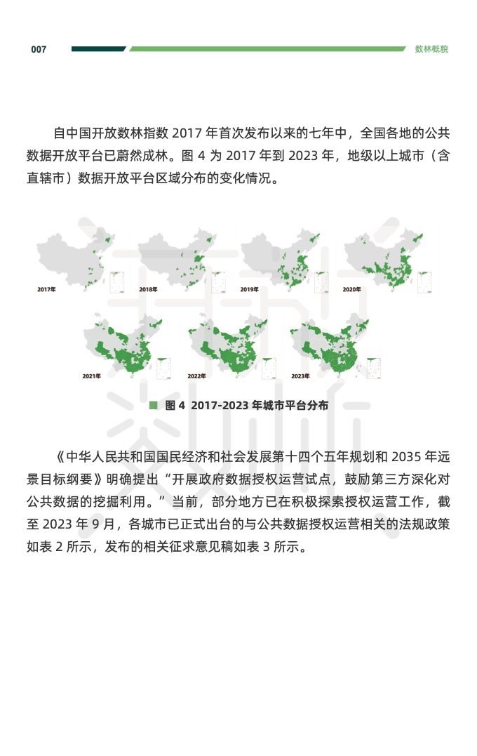 截至 2023 年 8 月,全国各地上线的城市公共数据开放平台的地区分 布如图 3 所示,颜色越深,代表平台上线时间越早。目前,所有直辖市, 福建省、广东省、广西壮族自治区、贵州省、湖北省、江苏省、江西省、 山东省、四川省与浙江省共 10 个省域所有下辖城市都已上线了公共数据开 放平台,形成我国最为密集的城市“开放数林”。同时,安徽省内的绝大 多数城市也已上线了开放平台。然而,陕西省、青海省内的所有城市以及 海南省、河南省、吉林省、辽宁省和云南省内的绝大多数城市尚未上线公 共数据开放平台。
