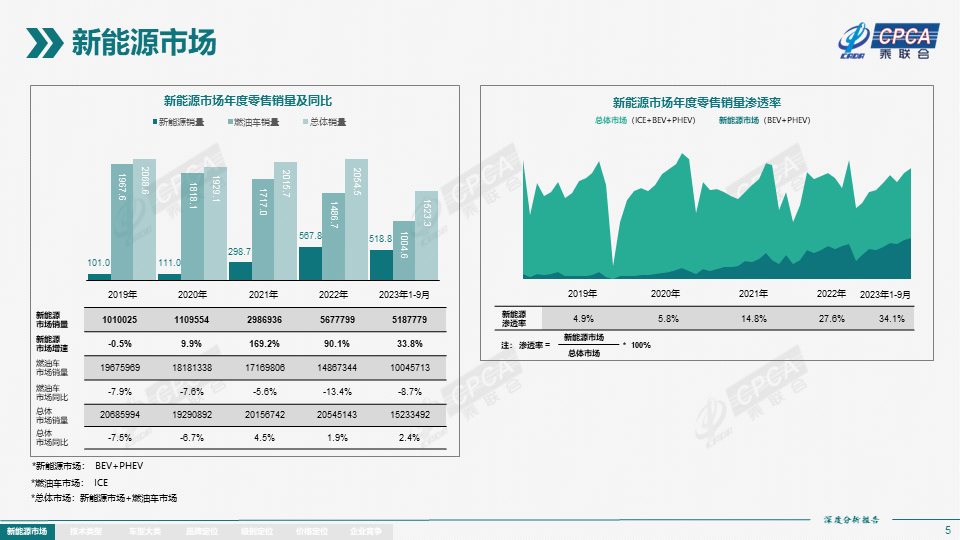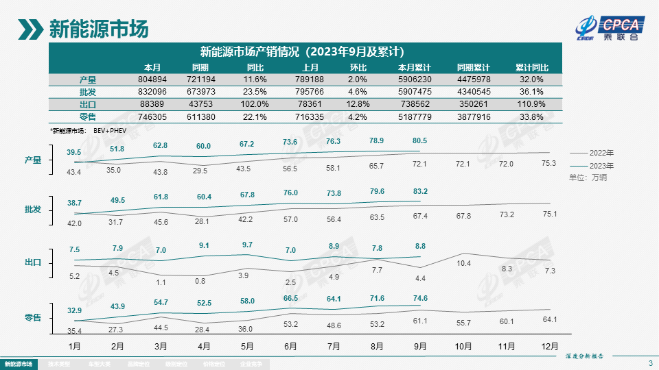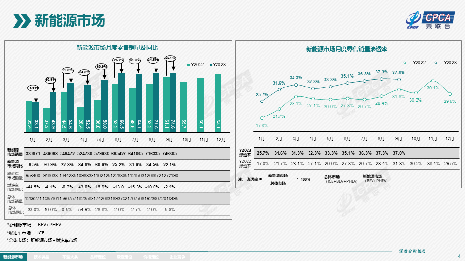 - 新能源市场月度及年度零售销量、同比、渗透率