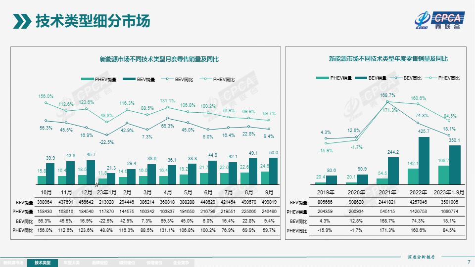 - 新能源市场各车型不同技术类型增速、销量及份额(2023年9月及累计)