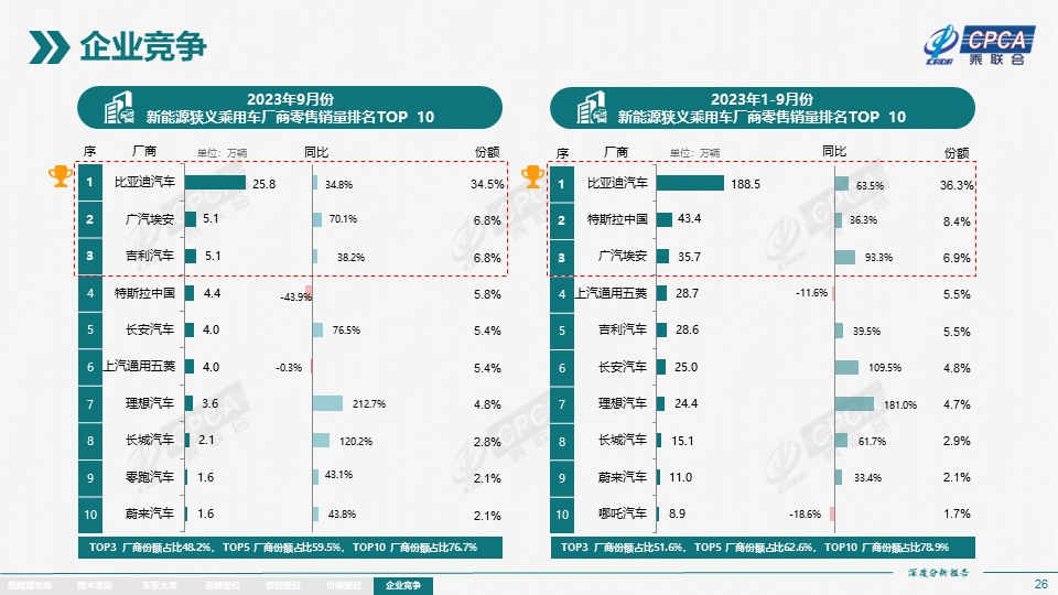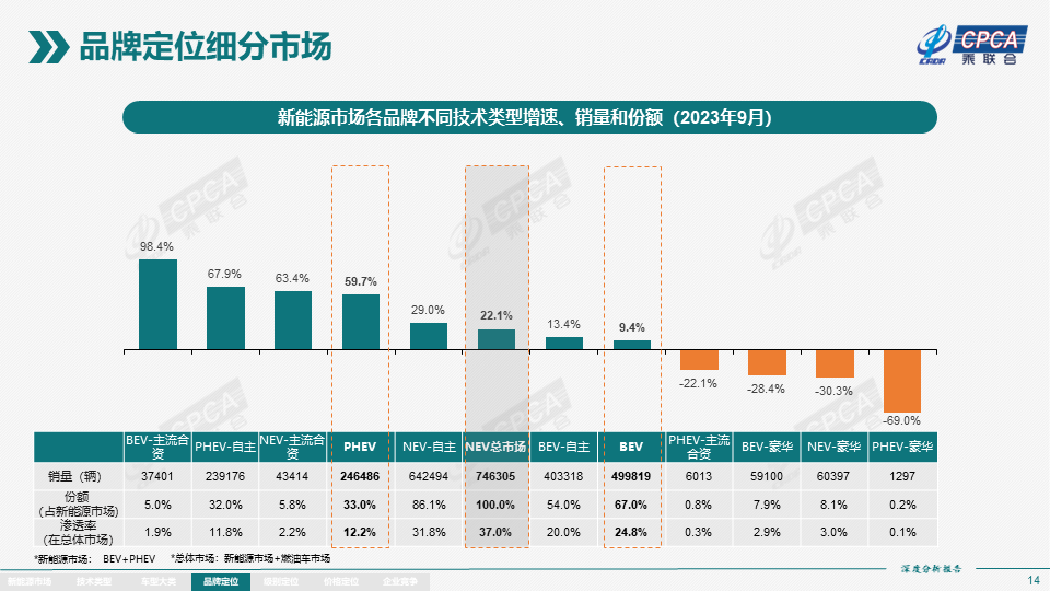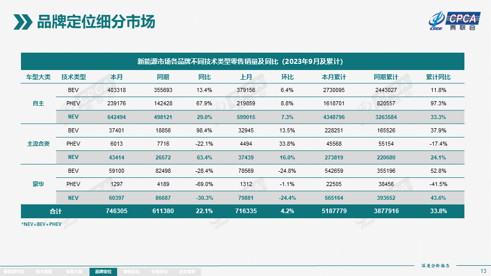 - 新能源市场各品牌不同技术类型增速、销量及份额(2023年9月及累计)