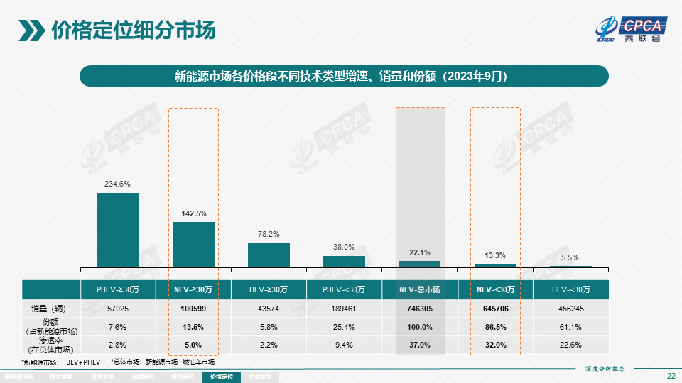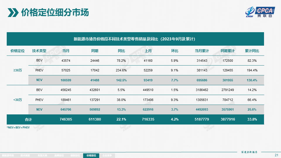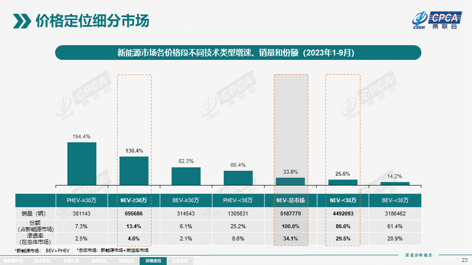 - 新能源市场各价格段不同技术类型增速、销量及份额(2023年9月及累计)