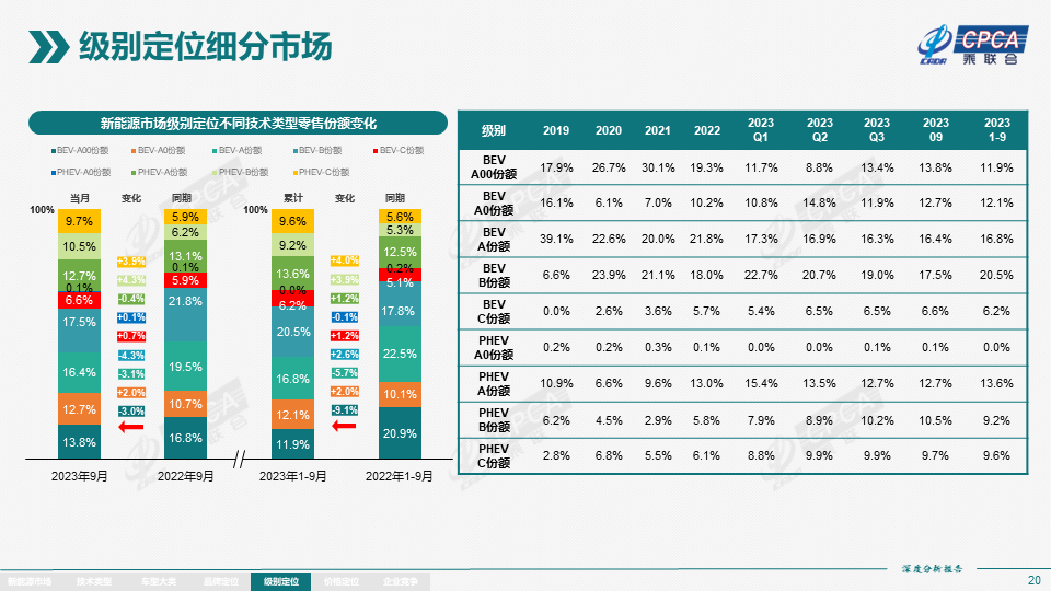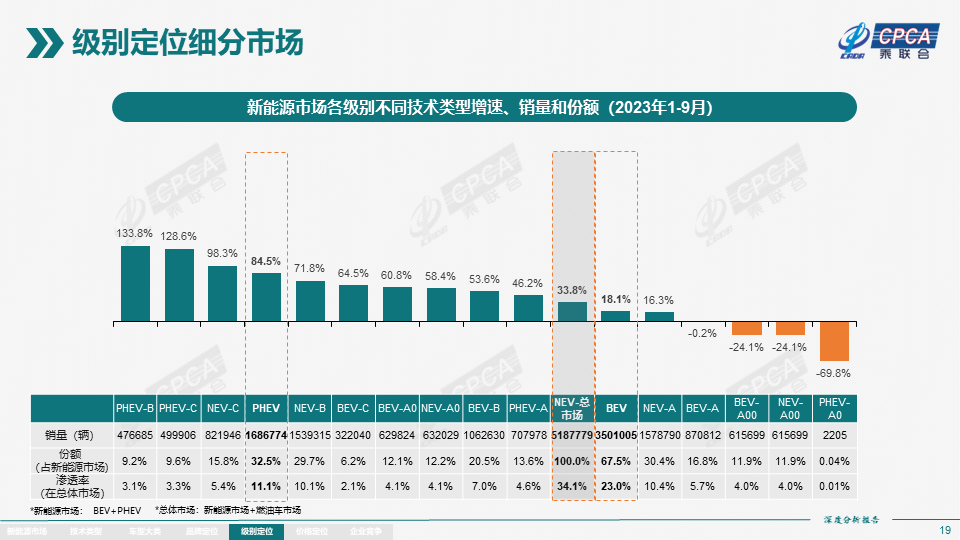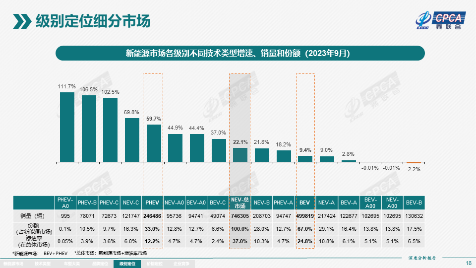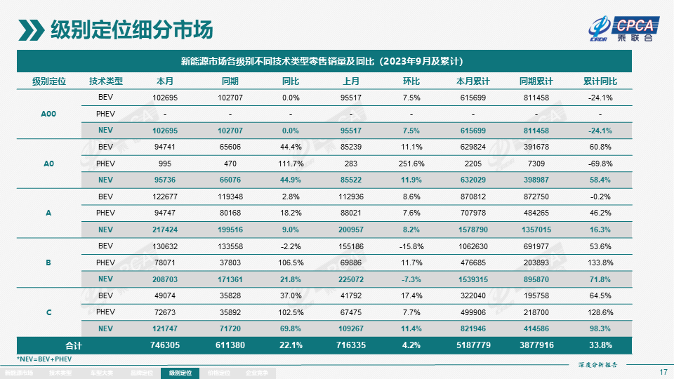 - 新能源市场各级别不同技术类型增速、销量及份额(2023年9月及累计)