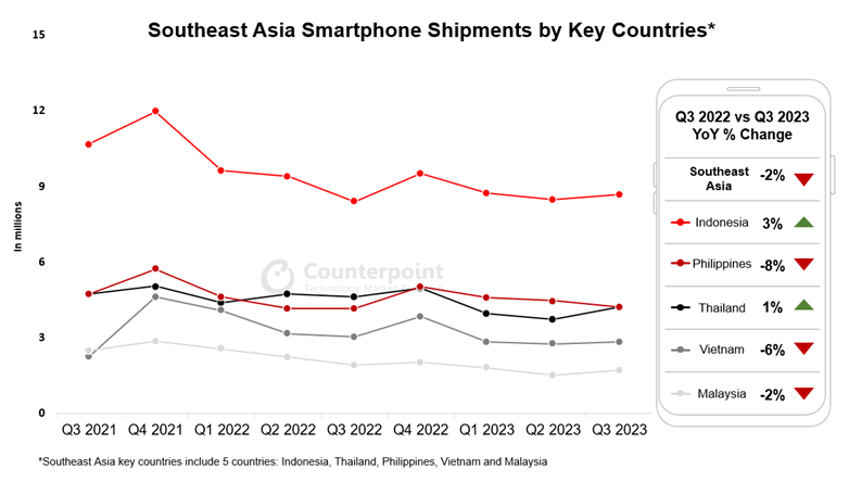 - 印度尼西亚和泰国的智能手机出货量增长平平,而菲律宾、马来西亚和越南等其他关键东南亚国家的智能手机出货量同比有所下降。
