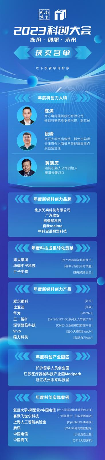 除了年度科创力人物,2023科创大会还正式宣布与颁发杰出科创企业、年度新锐科创力品牌、年度科技成果转化贡献、年度科创力产品、年度科创产业园区、年度科创实践案例等奖项。完整获奖名单如下(“杰出科创企业”基于2023中国企业科创力100强与分行业科创力排行第一评定,未包含在内):