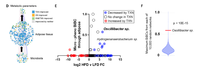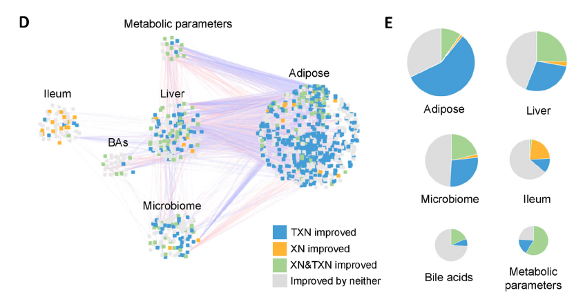 为了模拟HFD 诱导的代谢疾病,研究者使用了跨物种网络分析(transkingdom network analysis,图3)来研究疾病进展和治疗的关键调节因素。结果发现通过添加XN和TXN改善了大约 10% 的基因,而单独来看,TXN改善了脂肪组织网络中超过 50% 的基因表达,TXN仅改善1%。表明TXN比XN更有效,并且起作用的关键机制是通过脂肪组织发挥作用的。