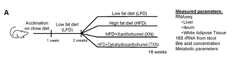 研究人员使用了饮食诱导的肥胖和代谢疾病小鼠模型,将 10 只小鼠随机分配到五组之一(图2):低脂饮食组(low fat diet,LFD)、高脂饮食组(high fat diet,LFD)、添加低含量XN(0.035%)的高脂饮食组、添加高含量XN(0.07%)的HFD和添加TXN(0.035%)的 HFD,饲养16 周。
