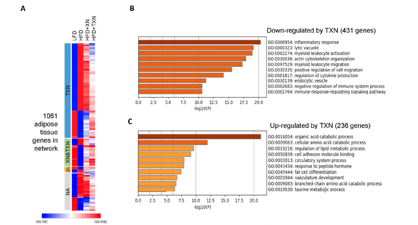 通过测量这些小鼠的肝脏、回肠和附睾脂肪组织(脂肪组织)的转录组、粪便中的微生物组组成、粪便中的胆汁酸浓度以及与代谢疾病相关的表型参数,结果发现TXN在恢复由肥胖饮食引起的代谢改变方面比XN更有效。