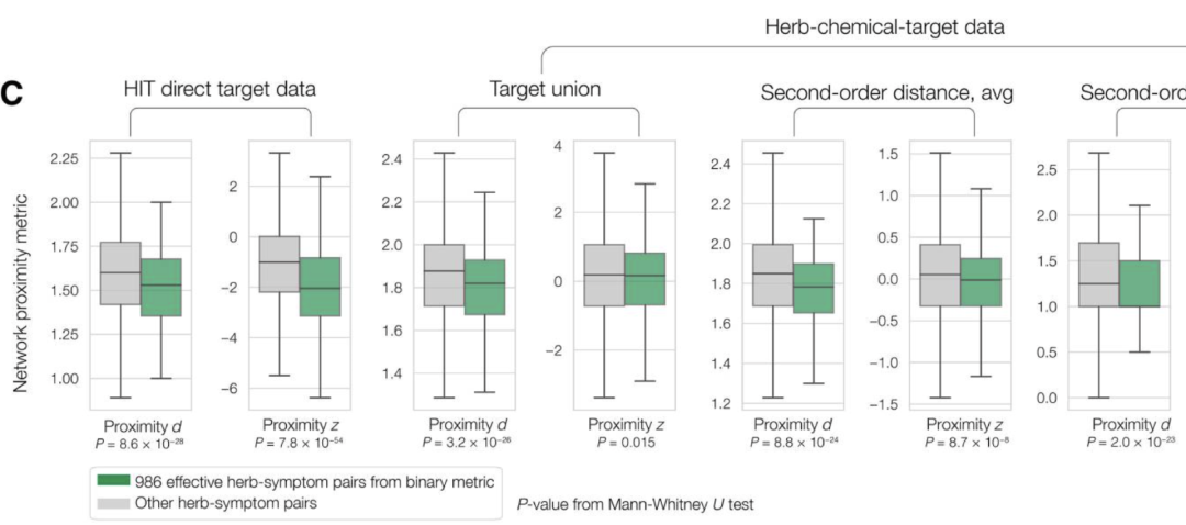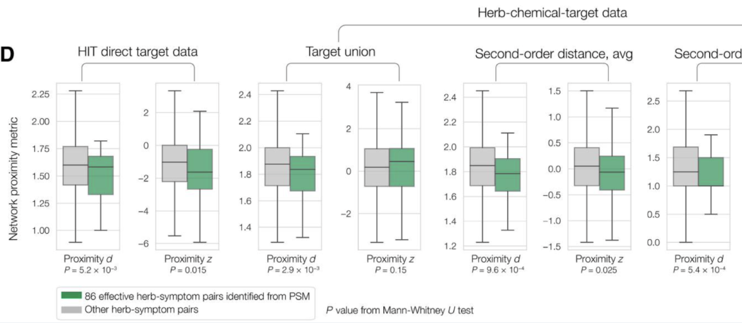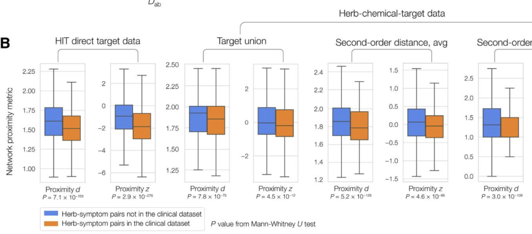 首先,研究者比较了患者数据集中出现的(代表医生开处方中的草药)和临床数据集中缺失(代表医生未开出的草药)的中草药-症状的网络接近度,观察到在所有的8个邻近管道中,患者数据集中的中草药-症状的网络接近指标明显低于临床数据集中缺失的。