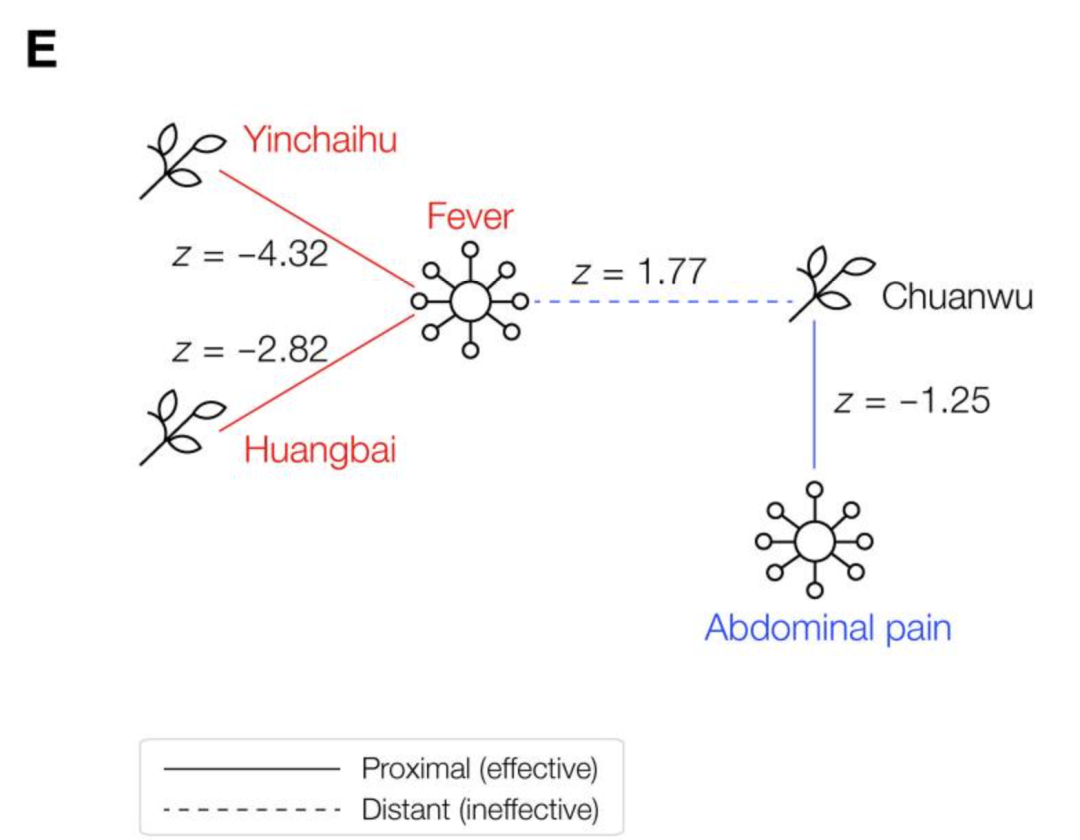 相反,与PPI中“发热”模块相距甚远的草药,比如:川乌的接近z评分为1.77,该分数意味着川乌不太可能对发热有效,这也与专家认知一致。在草药-症状网络上,川乌更接近于“腹痛”,z评分为−1.25,其抗炎、镇痛和抗肿瘤的作用也得到CHPH和中医的认可。