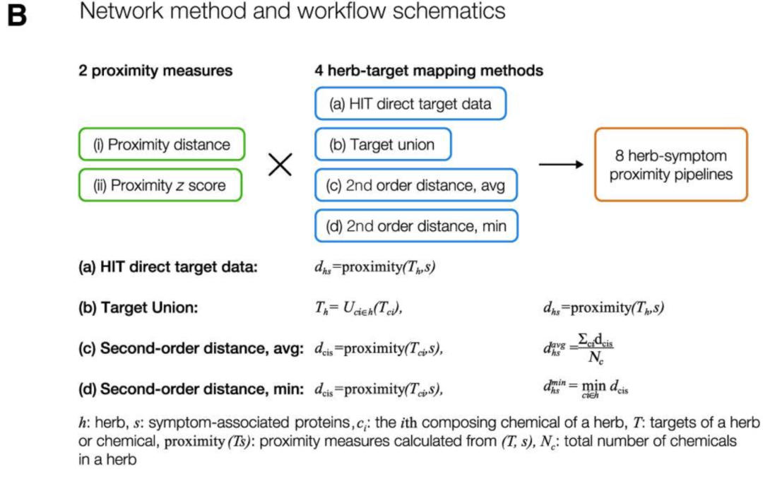 下一步,便是将中草药引入其中,确定中药-症状网络来描述治疗效果。研究者开发了一种由8个“管道(Pipeline)”组成的多模式方法,每个“管道”都会为每对草药-症状生成一个基于网络的指标。