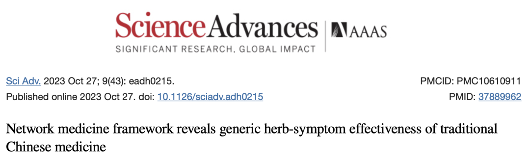 [1]Gan X, Shu Z, Wang X, Yan D, Li J, Ofaim S, Albert R, Li X, Liu B, Zhou X, Barabási AL. Network medicine framework reveals generic herb-symptom effectiveness of traditional Chinese medicine. Sci Adv. 2023 Oct 27;9(43):eadh0215. doi: 10.1126/sciadv.adh0215. Epub 2023 Oct 27. PMID: 37889962; PMCID: PMC10610911.