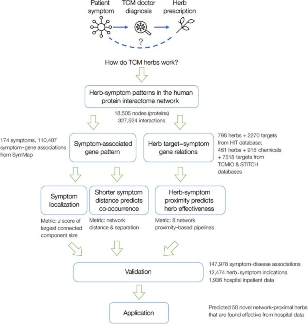 为填补这一空白,研究者提出了中药的网络医学理论与方法,认为中医临床辨证论治中的“对症下药”能通过人类蛋白质相互作用及其拓扑关系来解释。在这个方法中,研究者更关注症状而非疾病,该理念也与中医本身的“根据症状表型来诊断和治疗”的做法一致。
