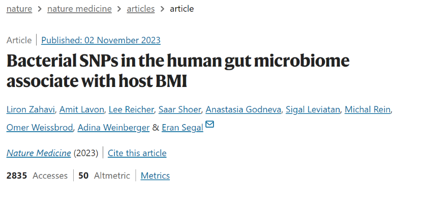 最近,Liron Zahavi等人在Nature Medicine发表了一篇题为Bacterial SNPs in the human gut microbiome associate with host BMI的文章则揭示了这一关联,表明了肠道微生物组中细菌的单核苷酸多态性(SNP)与宿主的体重指数(BMI)之间的相关性。