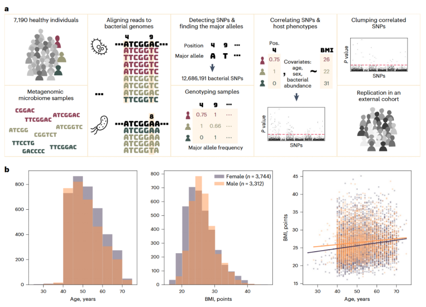 这项研究从7190个健康个体的队列中收集并获得了肠道宏基因组样本,使用全基因组关联研究(GWAS),进行SNP检测,随后将细菌SNP与宿主表型进行系统性地关联分析。