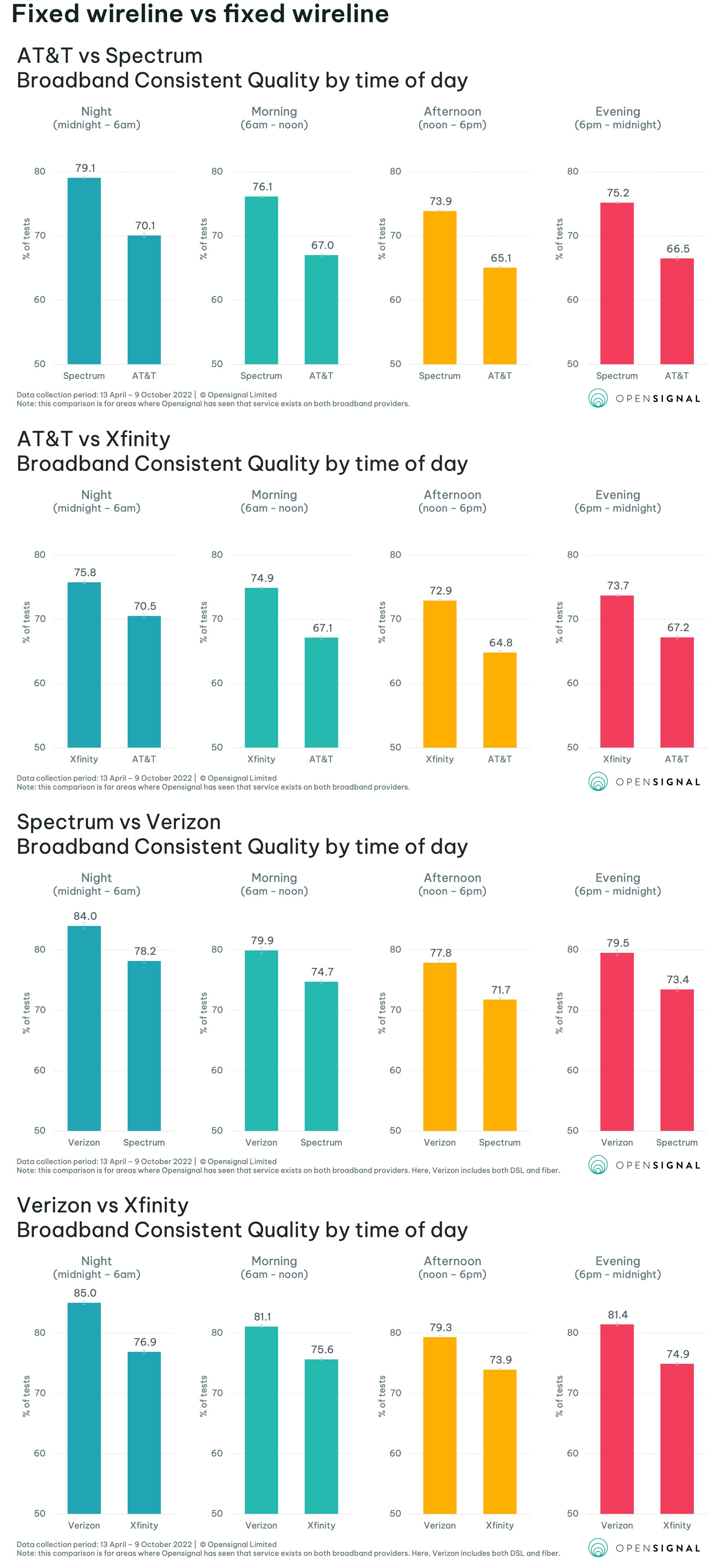 在固定有线服务提供商中,Verizon在网络繁忙的中午至下午6点之间的宽带一致质量得分最高,而Xfinity在繁忙时间(下午和晚上)和安静时间(晚上和早上)之间的差异最小。