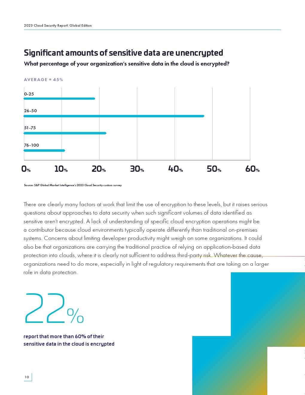 只有22%的受访者表示,他们60%或更多的云数据是加密的。平均而言,只有45%的敏感数据被加密。