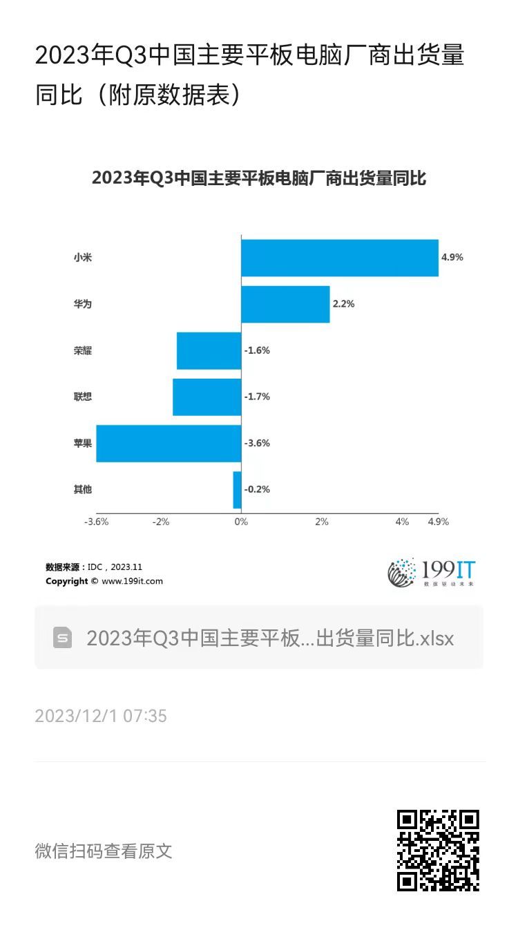 2023年Q3中国主要平板电脑厂商出货量同比(附原数据表) ​​​
