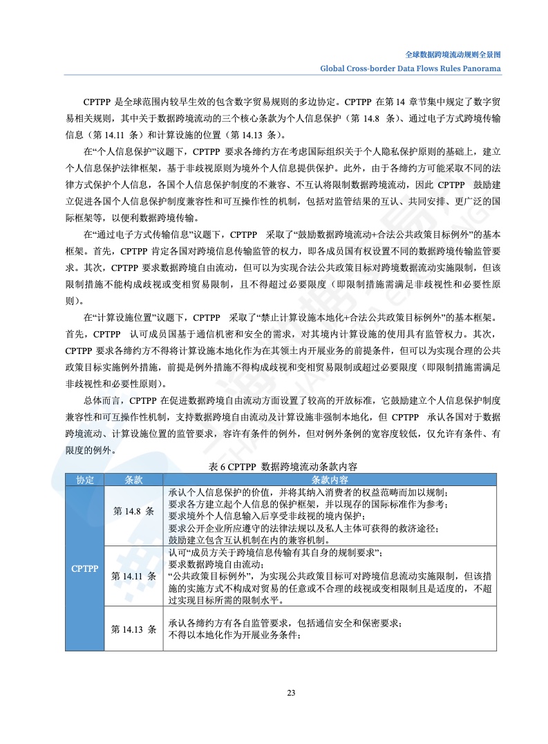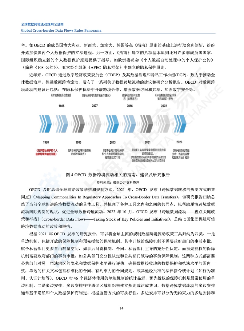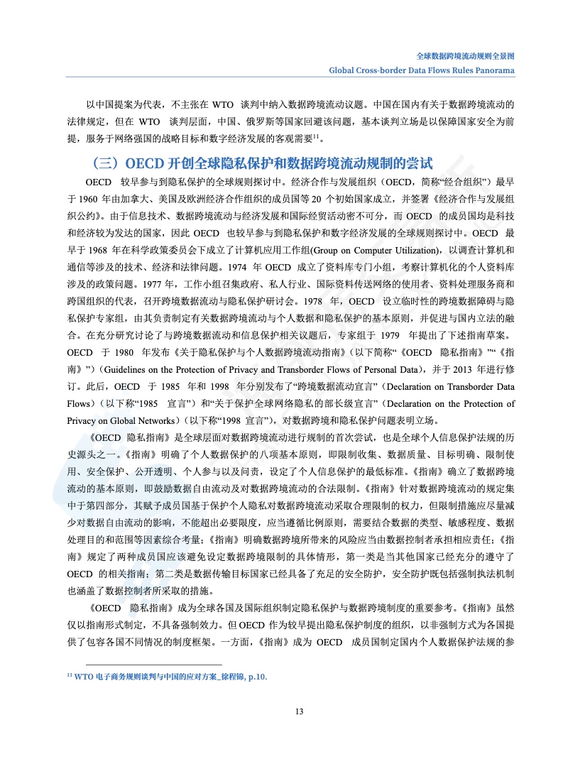 当前,数据跨境流动正在逐步超过贸易、投资全球化,成为驱动全球经济增长的新动能。本次报告,从 国际组织、国际贸易协定、经济体三个层次切入,聚焦十大国际机制安排(五个国际组织与五个国际贸易协 定)与十二大经济体,分析其关于数据跨境流动的规则与特点,并研判未来规则发展趋势,为我国参与全球 数字经济规则的制定提供借鉴与参考。