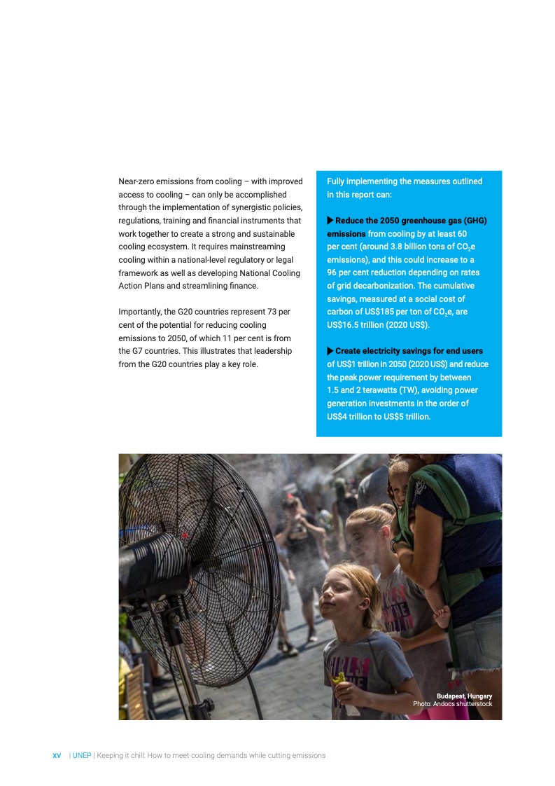 环境署执行主任安诺生指出,降温行业必须发展起来,以保护每个人免受不断上升的温度的影响,维护食品质量和安全,保持疫苗的稳定和经济的生产力。但她同时强调,“这种发展不能以造成更加严重的气候影响为代价”,各国和降温行业必须迅速行动,确保低碳降温的增长。