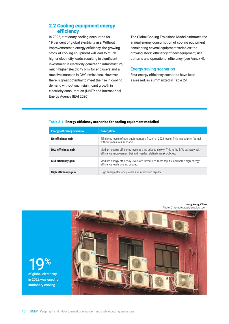 其中包括:采取隔热、自然遮阳、通风和反射面等被动降温措施,从而减少冷却负荷,以及对降温能力的需求增长;提高效率标准并对所有降温设备进行更好的标识,到2050年使全球降温设备的平均效率达到现有水平的三倍;执行《蒙特利尔议定书基加利修正》,以更快的速度逐步减少使用氢氟碳化物制冷剂。