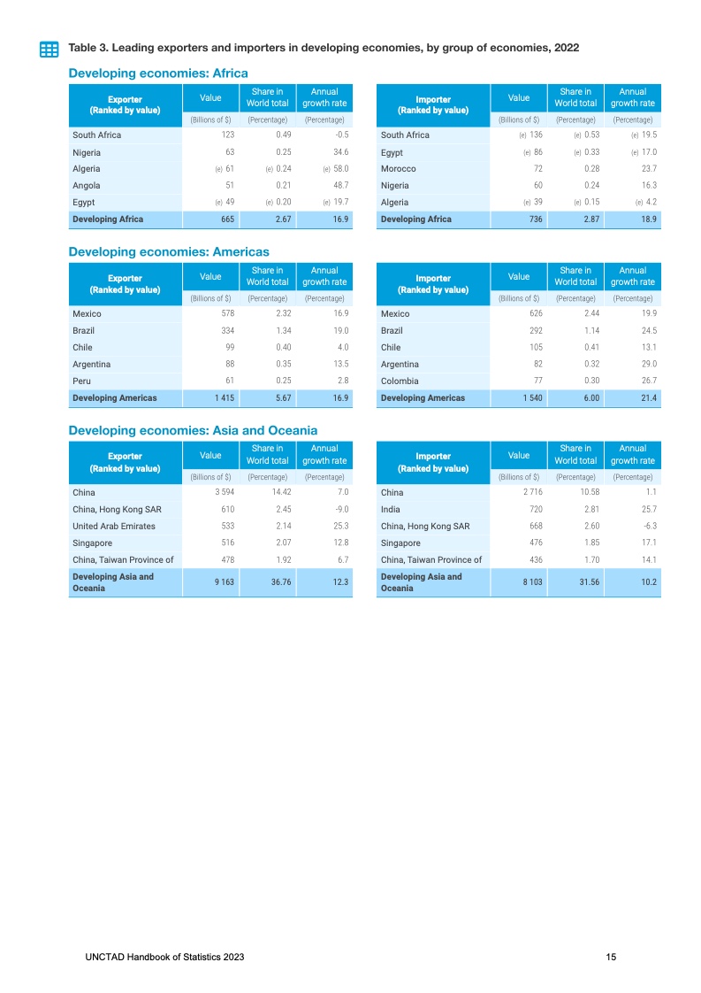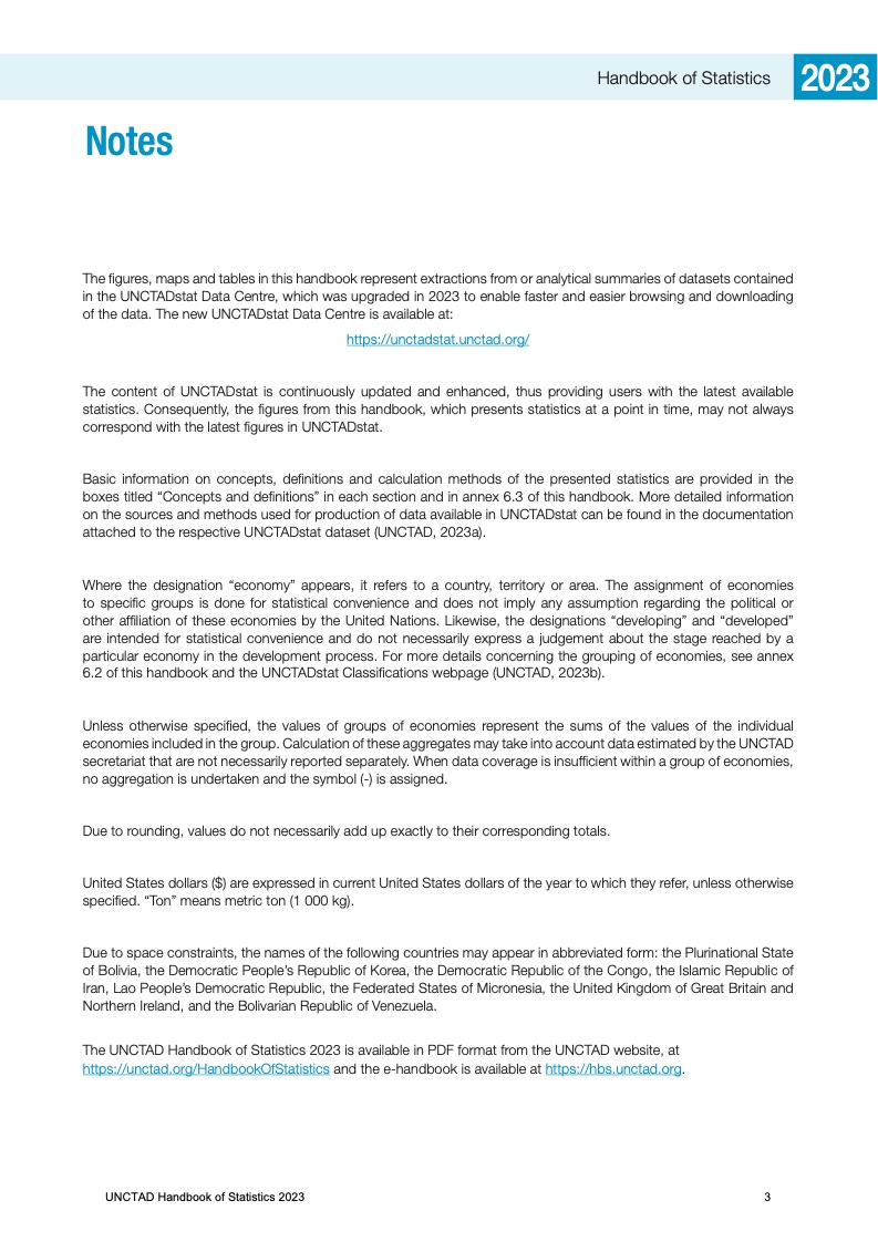 贸发会议年度出版物《统计手册》为每年的全球贸易和发展趋势分析提供参考价值。手册从区域、国家和行业的角度,提供官方统计数据和基于实时估计的预测,帮助各国政府在最终官方统计数据发布之前,预测贸易和经济的变化。