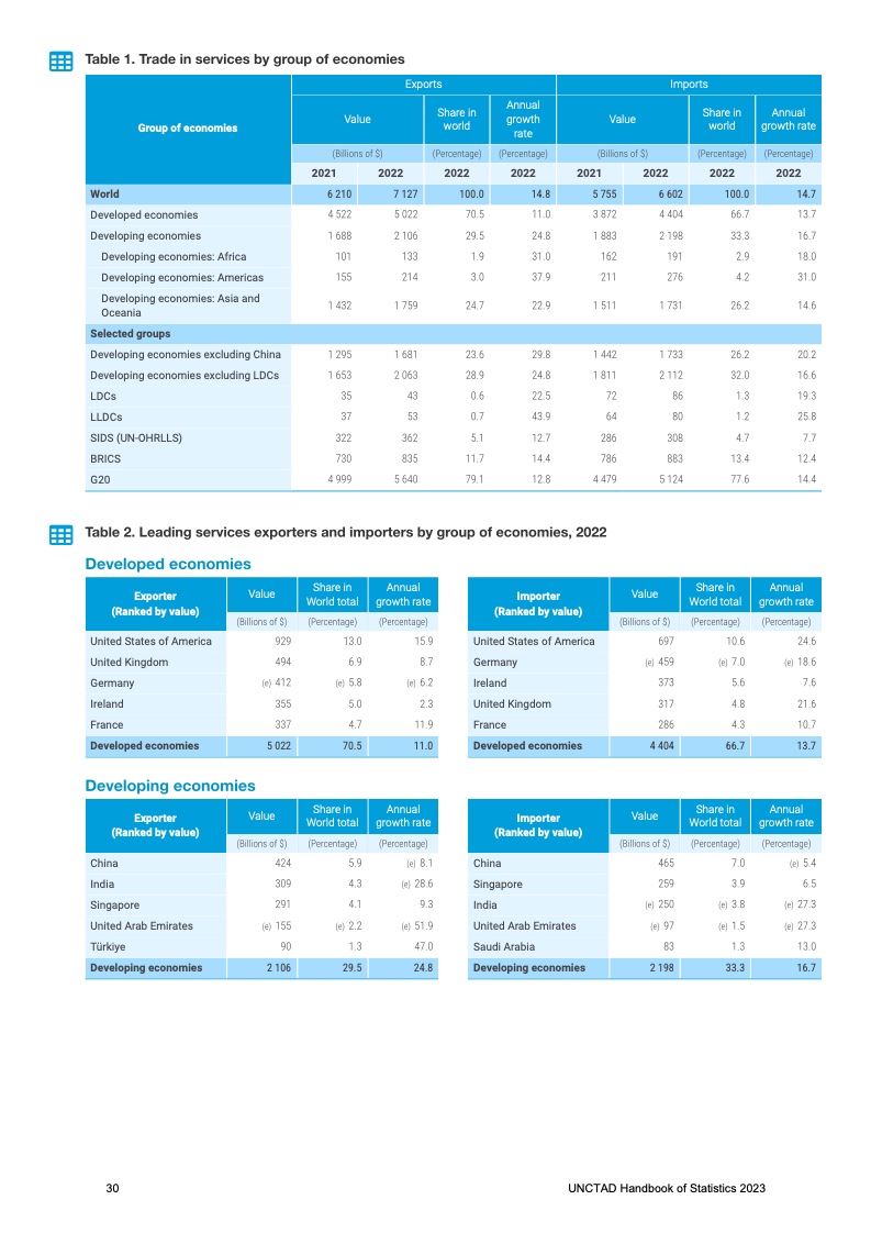 服务贸易继续增长:2022年服务贸易出现反弹,增长了14.8%,超过新冠疫情前的水平。发展中国家的服务贸易增长较快,2022年占全球市场的份额达到迄今为止最高水平,为30%。贸发会议预测,2023年全球服务贸易将增长7%左右。