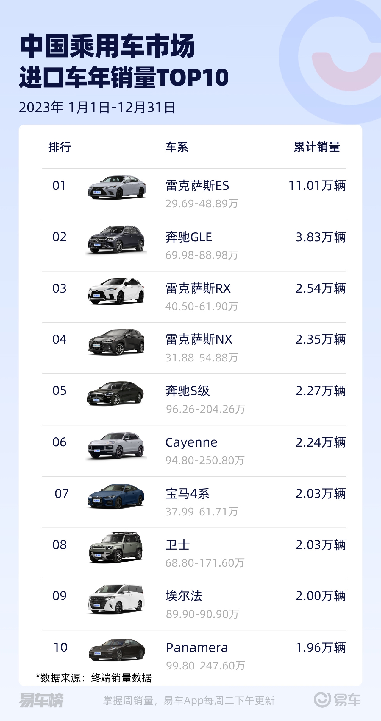 此外,2023年进口车型前十榜单中,雷克萨斯ES以11.01万辆的销量拿下第一,该车目前的优惠幅度较大,让利促销是其后半年销量提振的重要原因。