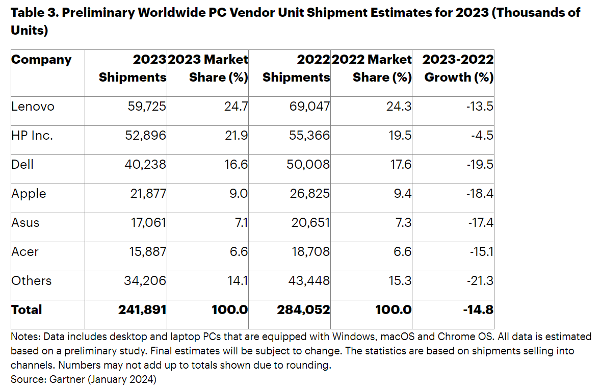 2023年是PC历史上最糟糕的一年,销量下降了14.8%。这是连续第二年出现两位数的下降。2023年全球PC出货量总计2.418亿台,低于2022年的2.84亿台。