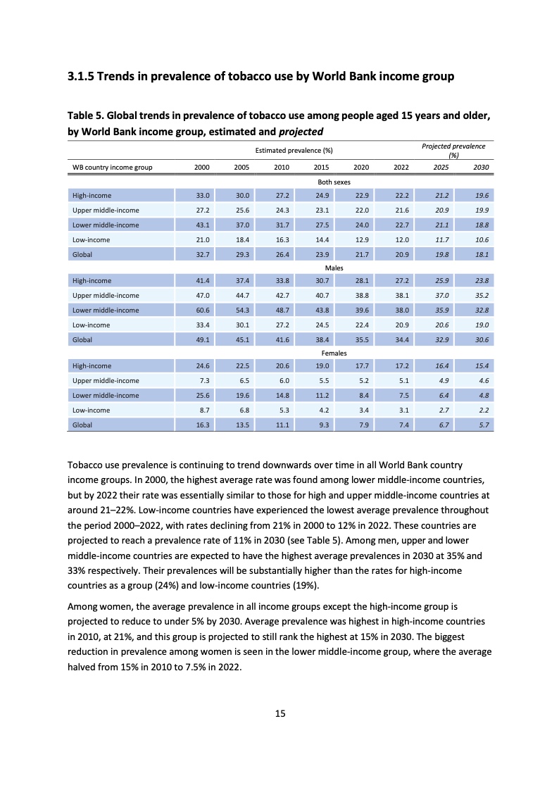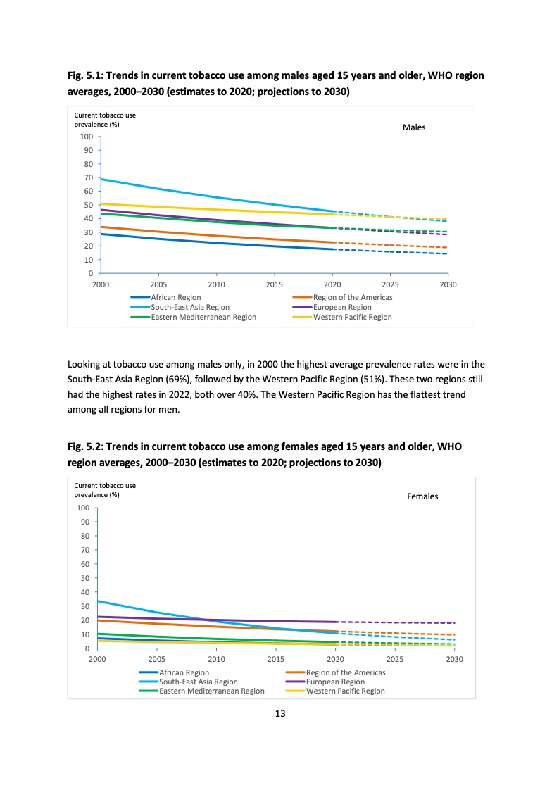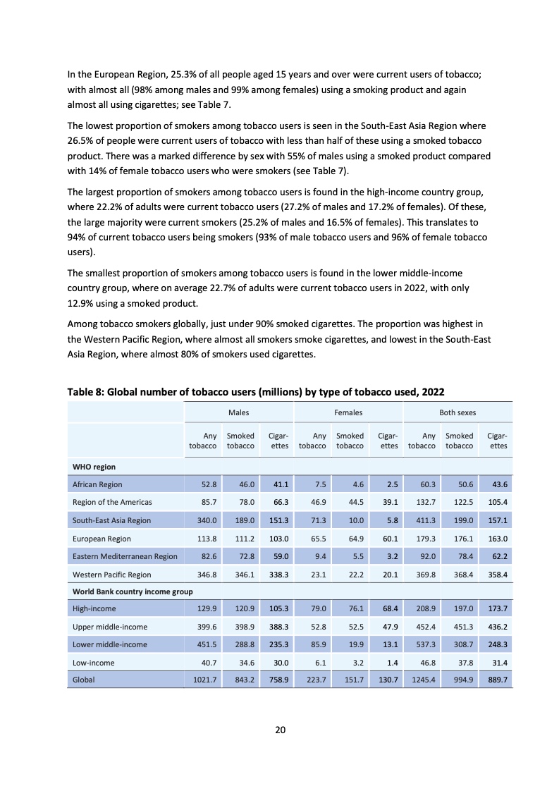 目前,东南亚地区的烟草使用率最高,为26.5%,欧洲紧随其后,为25.3%。欧洲的女性烟草使用率是全球平均水平的两倍多,而且下降速度远低于其他所有地区。