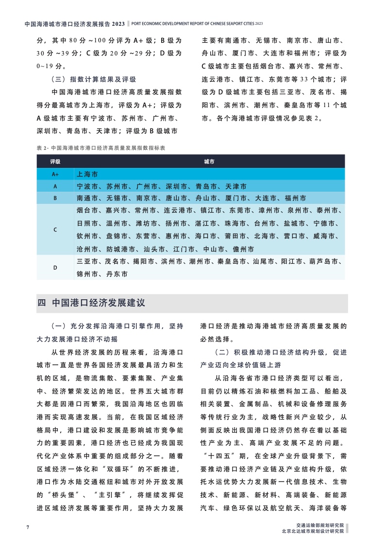 为了更为全面地反映全国59个海港城市港口经济发展水平,《报告》综合各个城市港口运输、临港工业、临港服务业和港产城协调等四个纬度共50个主要指标,全方位、立体地构建出中国海港城市港口经济高质量发展指数,将59个海港城市指数测算结果分为A、B、C、D四级。其中,中国海港城市港口经济高质量发展指数得分最高城市为上海市,评级为A+。