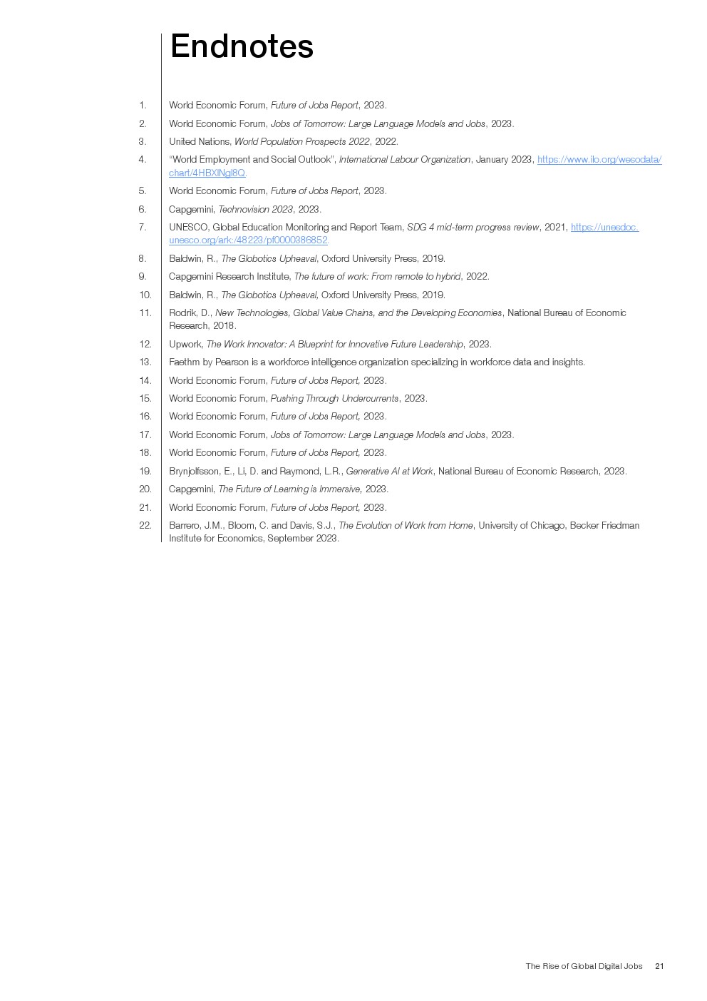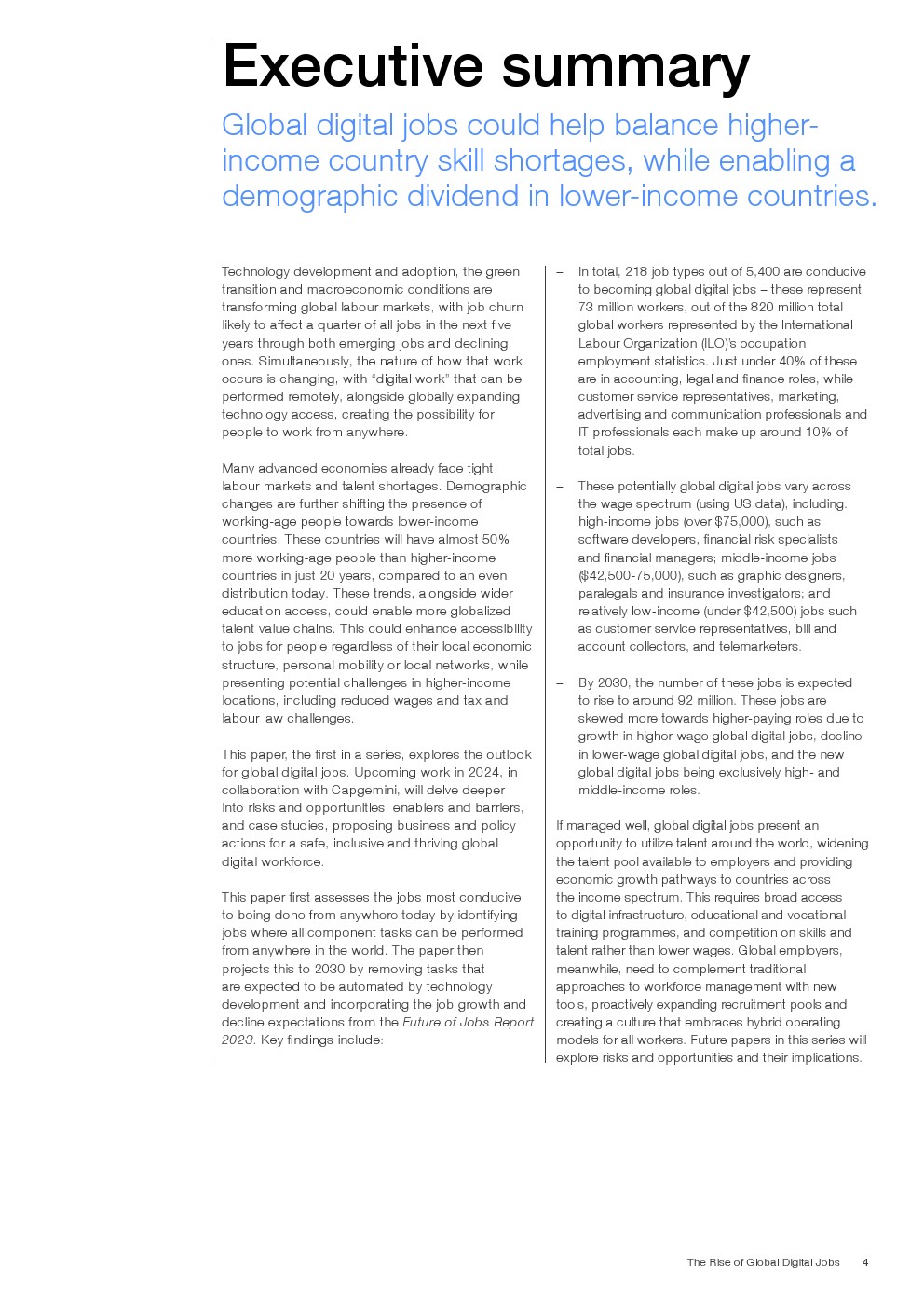 技术的发展和采用、绿色转型和宏观经济状况正在改变全球劳动力市场。在未来五年内,就业流失可能会影响到1/4的就业岗位,包括新兴就业岗位和衰退就业岗位。与此同时,工作方式的本质正在发生变化,可以远程完成的“数字工作”,以及全球范围内不断扩大的技术访问,为人们在任何地方工作创造了可能性。