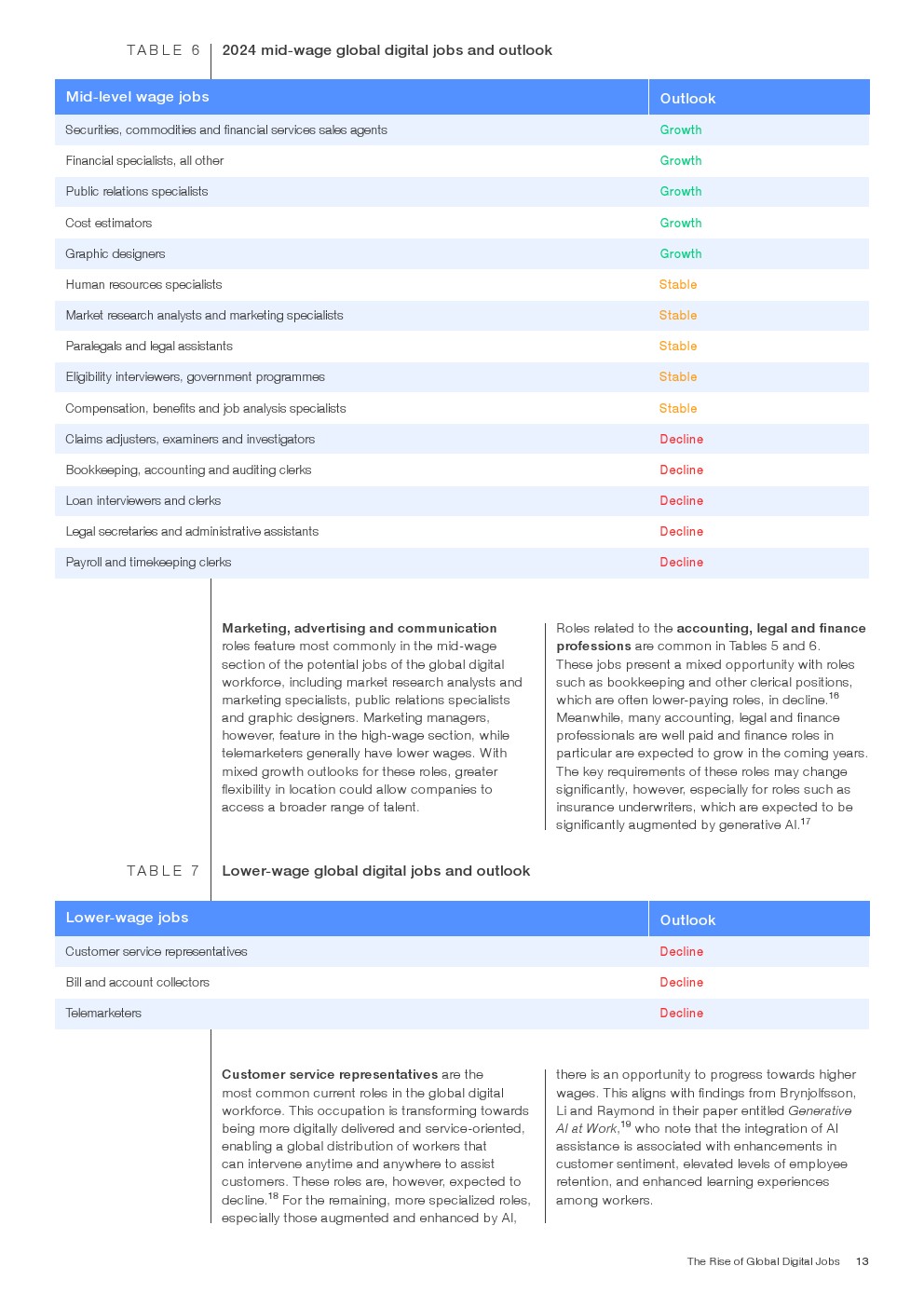 这些潜在的全球数字化工作因工资范围而异,包括:高收入工作(超过7.5万美元),如软件开发人员、金融风险专家和财务经理;中等收入工作(42,500-75,000美元),如平面设计师、律师助理和保险调查员;以及相对低收入(低于42,500美元)的工作,如客户服务代表、账单收账员和电话推销员。