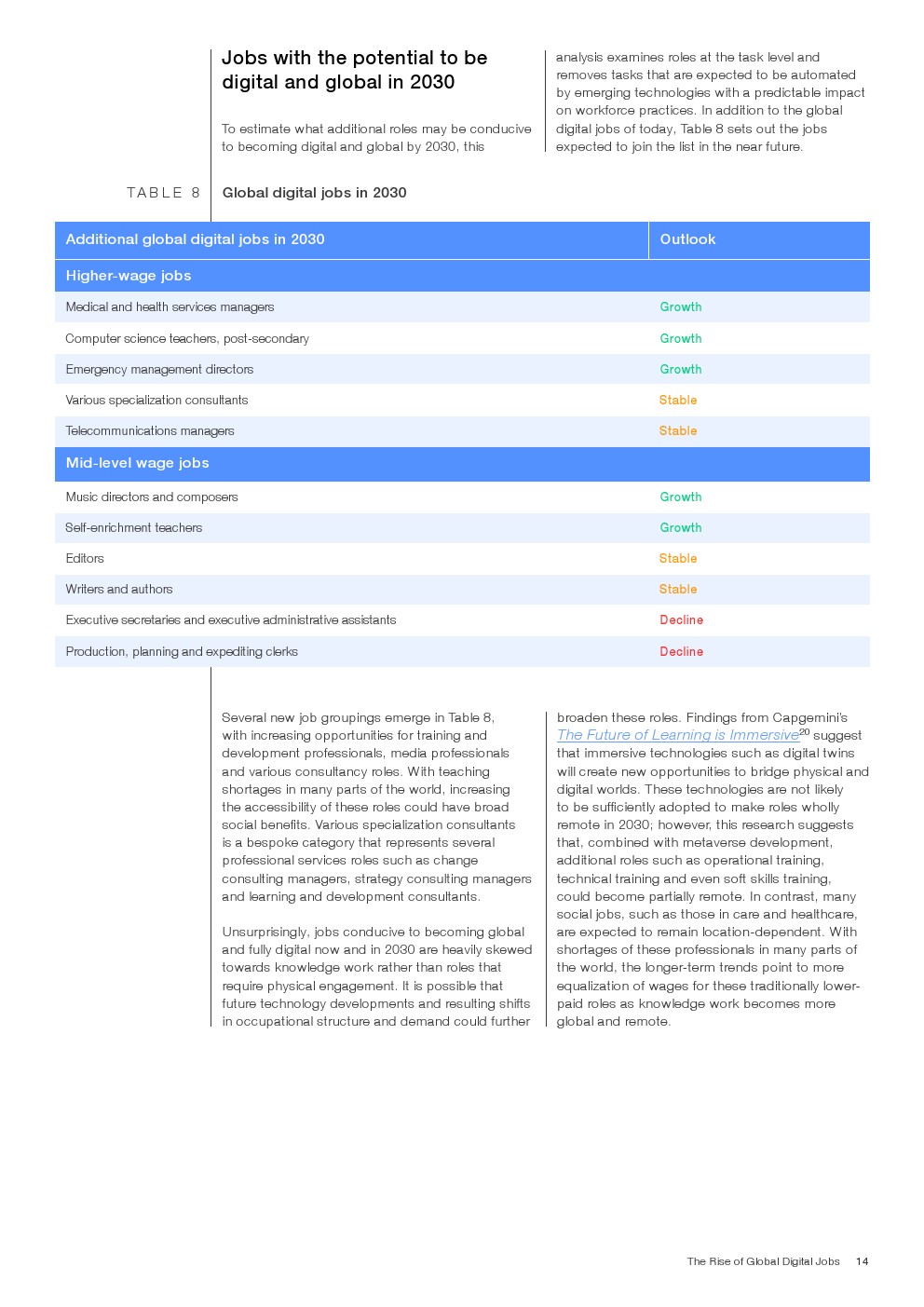报告首先评估了当今最有利于在任何地方完成的工作。然后,通过剔除预计将因技术发展而实现自动化的任务,并结合《2023年未来就业报告》中的就业增长和下降预期,预测到2030年的情况。