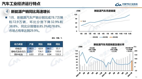 数据显示,1月份新能源汽车产销分别完成78.7万辆和72.9万辆,同比分别增长85.3%和78.8%,环比分别下降32.9%和38.8%,市场占有率达到29.9%。