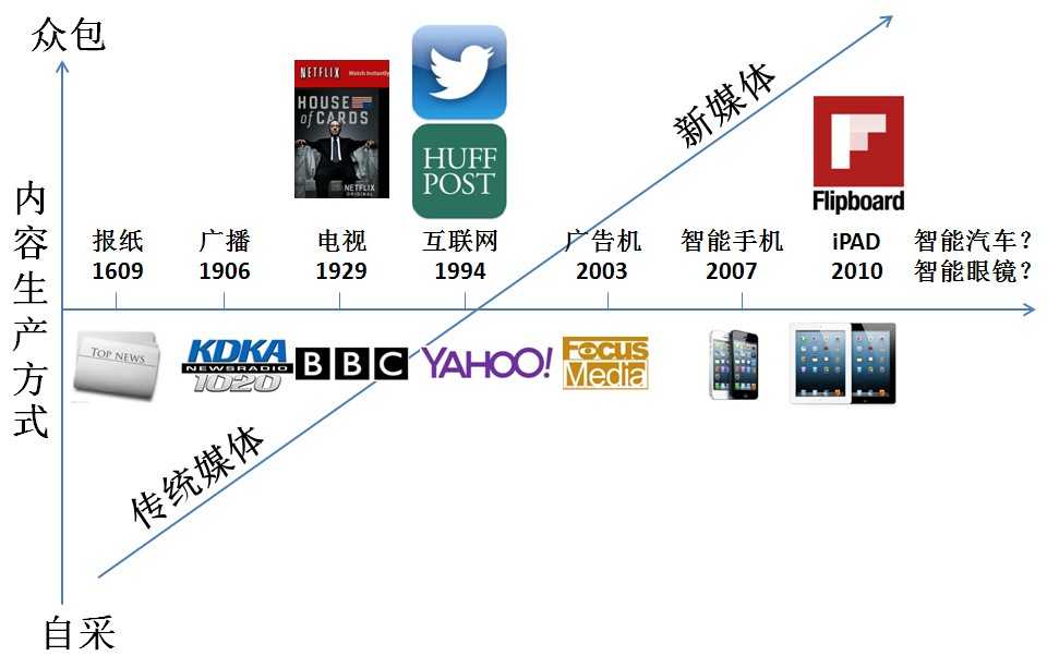 一是随着技术革新,新型媒体平台层出不穷,且时间间隔越来越短。报纸之后300年才出现广播电视,之后70年才出现互联网媒体,但近些年来楼宇液晶、智能手机、iPad层出不穷,而未来媒体也将很可能进入智能手表、Tesla电动车的中控屏幕,或是Google Glass的镜片上。