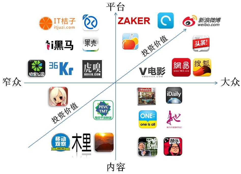 媒体,以其潜在受众的广度,和内容的生产方式分别为纵横坐标系,可粗略分为四个象限。其中,面向大众的平台型媒体最具投资价值,而窄众内容型媒体则成长空间有限。