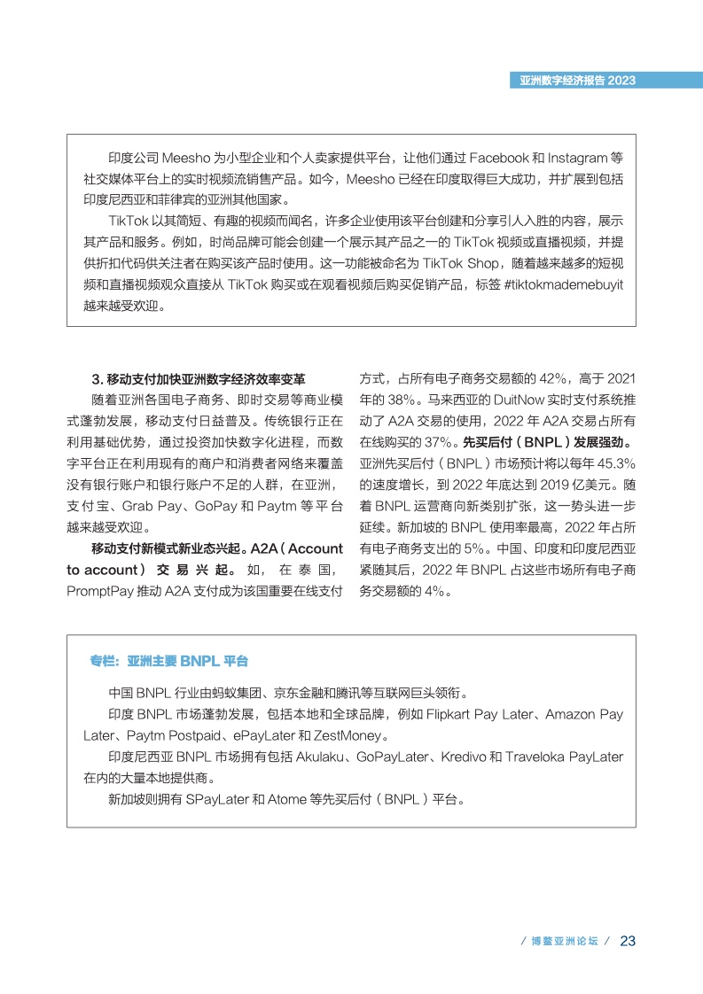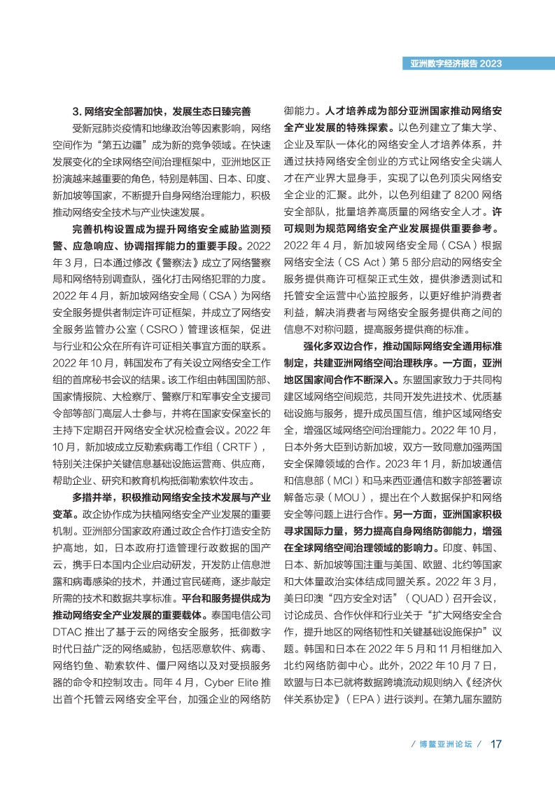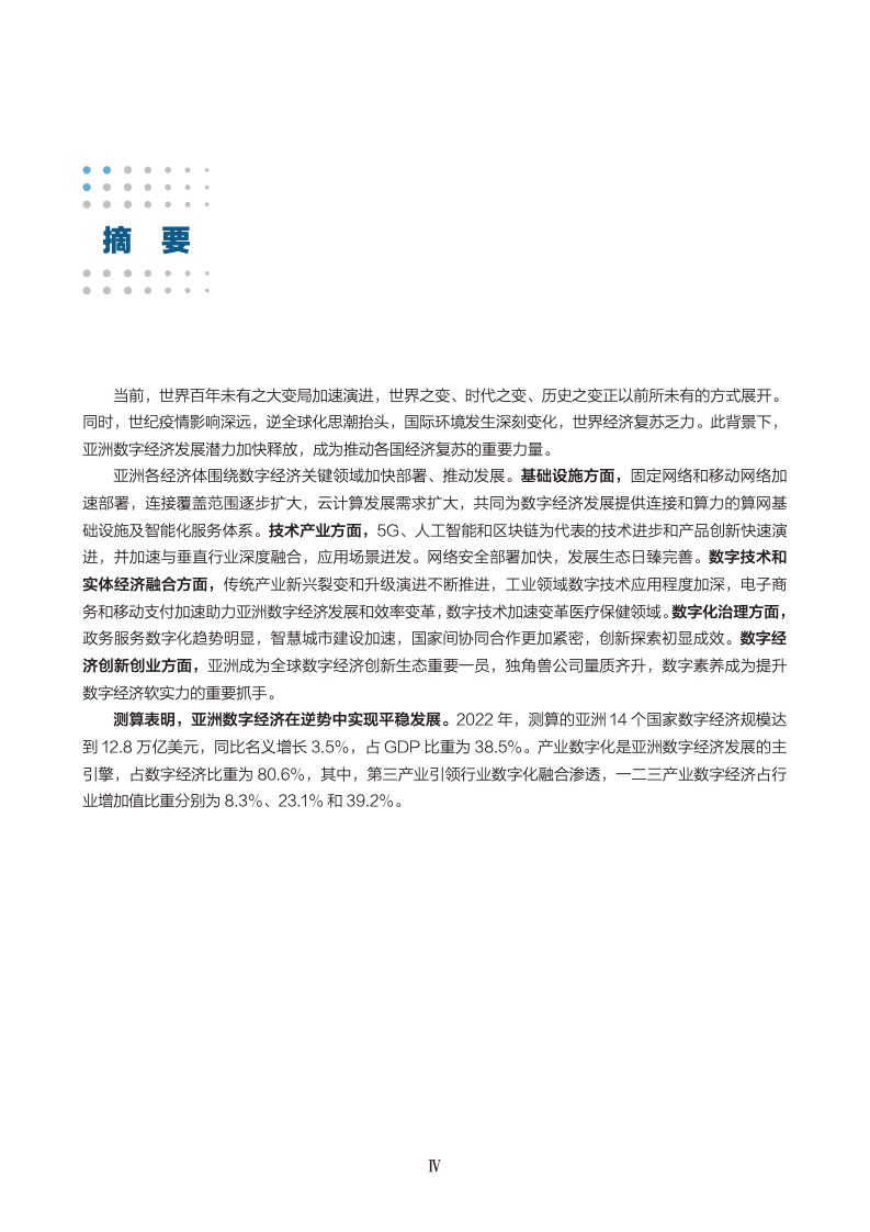 亚洲各经济体围绕数字经济关键领域加快部署、推动发展。基础设施方面,固定网络和移动网络加 速部署,连接覆盖范围逐步扩大,云计算发展需求扩大,共同为数字经济发展提供连接和算力的算网基 础设施及智能化服务体系。技术产业方面,5G、人工智能和区块链为代表的技术进步和产品创新快速演 进,并加速与垂直行业深度融合,应用场景迸发。网络安全部署加快,发展生态日臻完善。数字技术和 实体经济融合方面,传统产业新兴裂变和升级演进不断推进,工业领域数字技术应用程度加深,电子商 务和移动支付加速助力亚洲数字经济发展和效率变革,数字技术加速变革医疗保健领域。数字化治理方面, 政务服务数字化趋势明显,智慧城市建设加速,国家间协同合作更加紧密,创新探索初显成效。数字经 济创新创业方面,亚洲成为全球数字经济创新生态重要一员,独角兽公司量质齐升,数字素养成为提升 数字经济软实力的重要抓手。