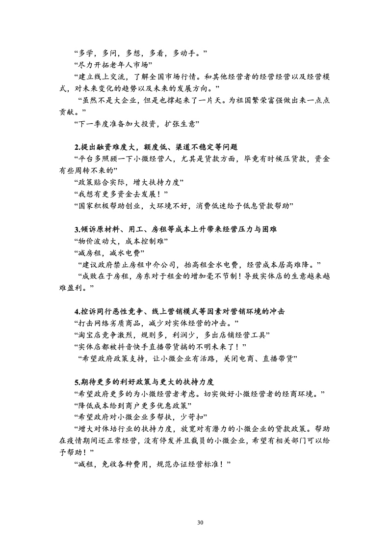 7、小微经营者对本地区营商环境的评价满意度环比有所下降,所反映的营商环境存在的具体问题主要集中在乱收费乱罚款乱摊派、市场准入不公平、停业停产“一刀切”以及监管与执法公平公正等方面。