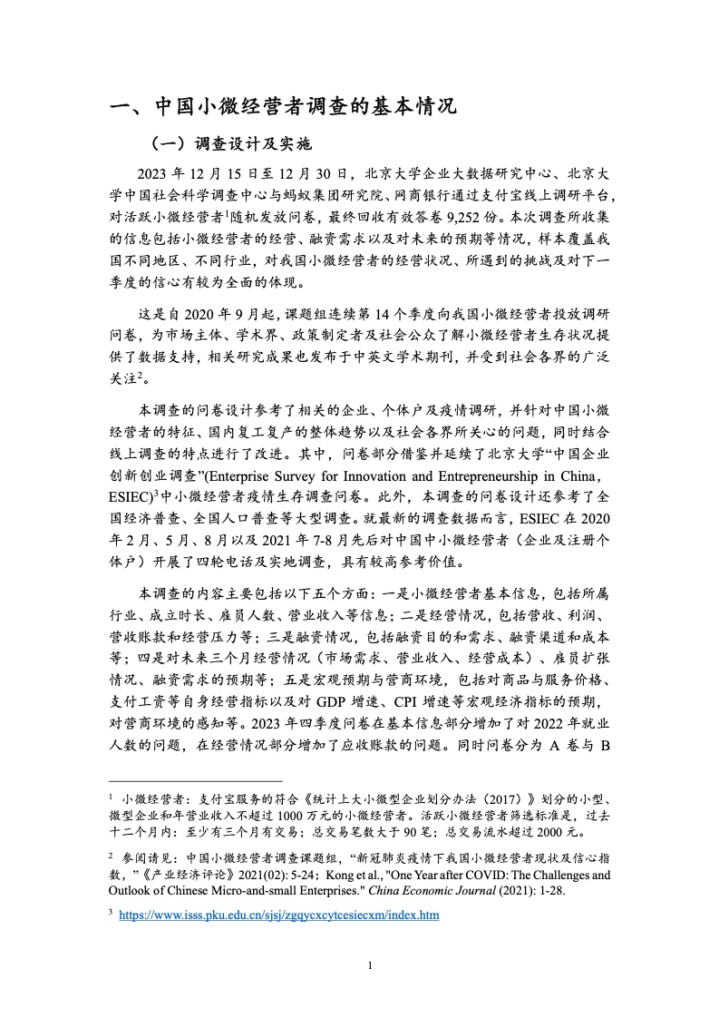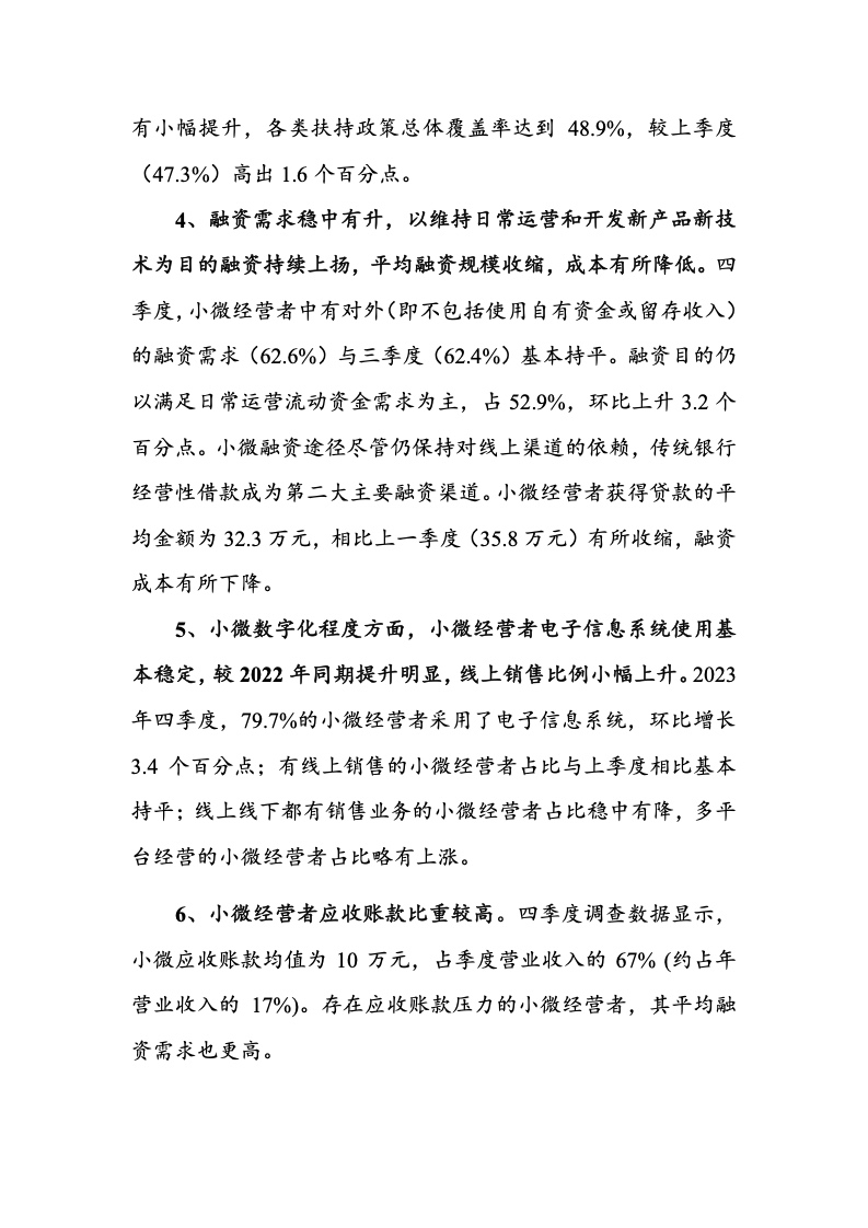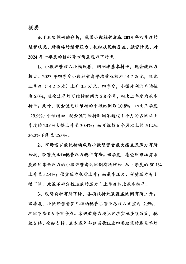 基于本次调研的分析,我国小微经营者在 2023 年四季度的经营状况、所面临的经营压力、扶持政策的覆盖、融资情况、对2024 年一季度的信心等方面呈现以下特点: