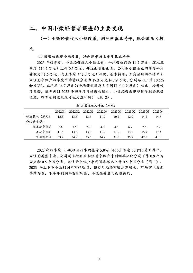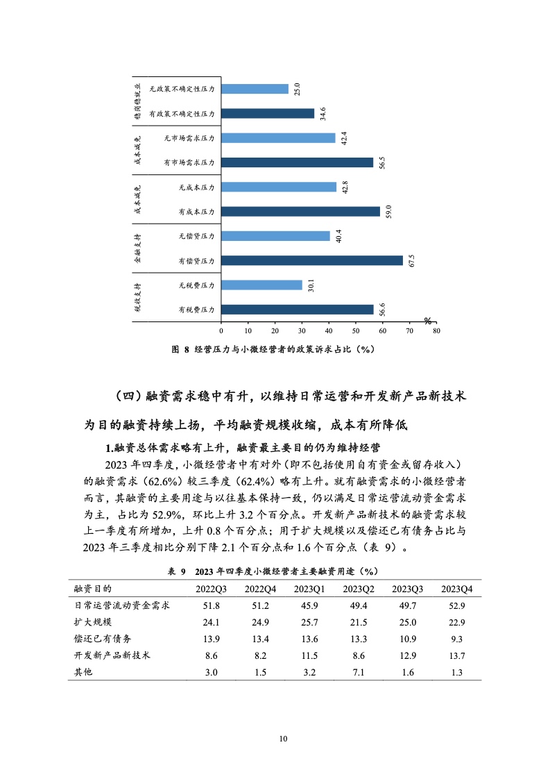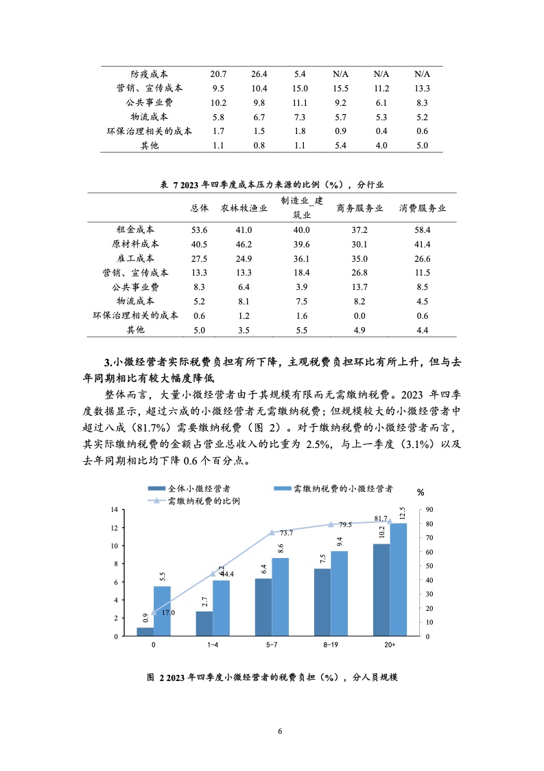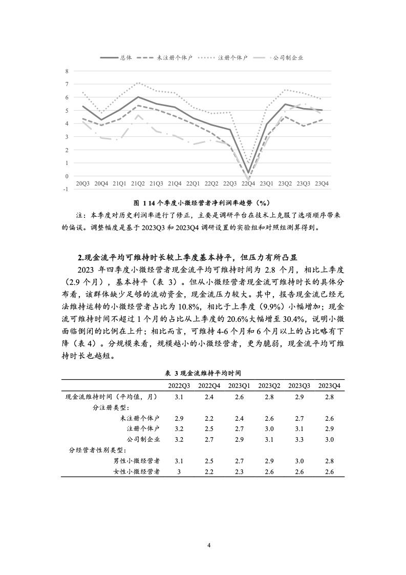 1、小微经营收入小幅改善,利润率基本持平,现金流压力较大。2023 年四季度小微经营者平均营业额为 14.7 万元,环比三季度(14.2 万元)上升0.5 万元。四季度,小微净利润率均值为5.0%,现金流平均可维持时间为 2.8 个月,相比上季度均基本持平。此外,现金流无法维持的小微比例为10.8%,相比三季度(9.9%)小幅增加,现金流可维持时间不超过1 个月的占比从上季度的 20.6%大幅上升至 30.4%;而可维持 6 个月以上的占比从26.2%下降至25.0%。