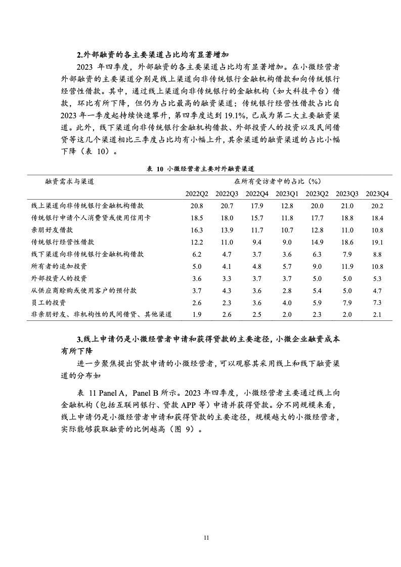 4、融资需求稳中有升,以维持日常运营和开发新产品新技术为目的融资持续上扬,平均融资规模收缩,成本有所降低。四季度, 小微经营者中有对外(即不包括使用自有资金或留存收入)的融资需求(62.6%)与三季度(62.4%)基本持平。融资目的仍以满足日常运营流动资金需求为主,占 52.9%,环比上升 3.2 个百分点。小微融资途径尽管仍保持对线上渠道的依赖,传统银行经营性借款成为第二大主要融资渠道。小微经营者获得贷款的平均金额为32.3 万元,相比上一季度(35.8 万元)有所收缩,融资成本有所下降。